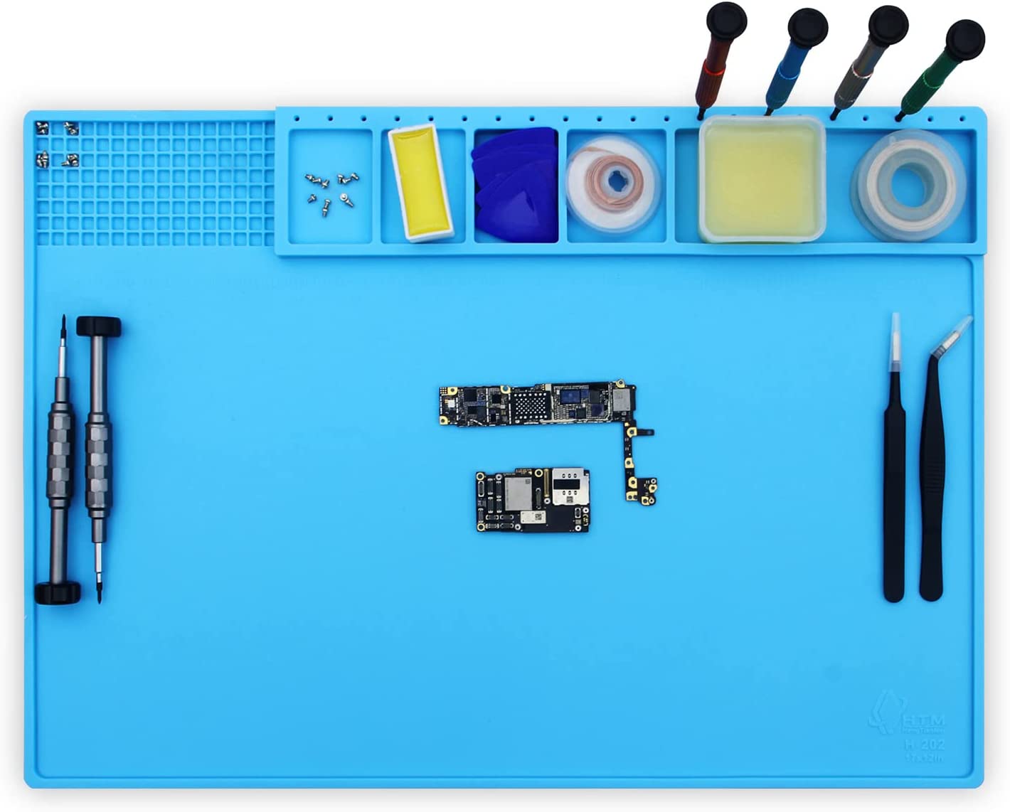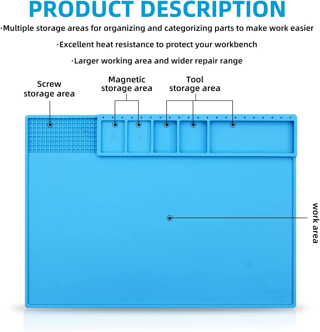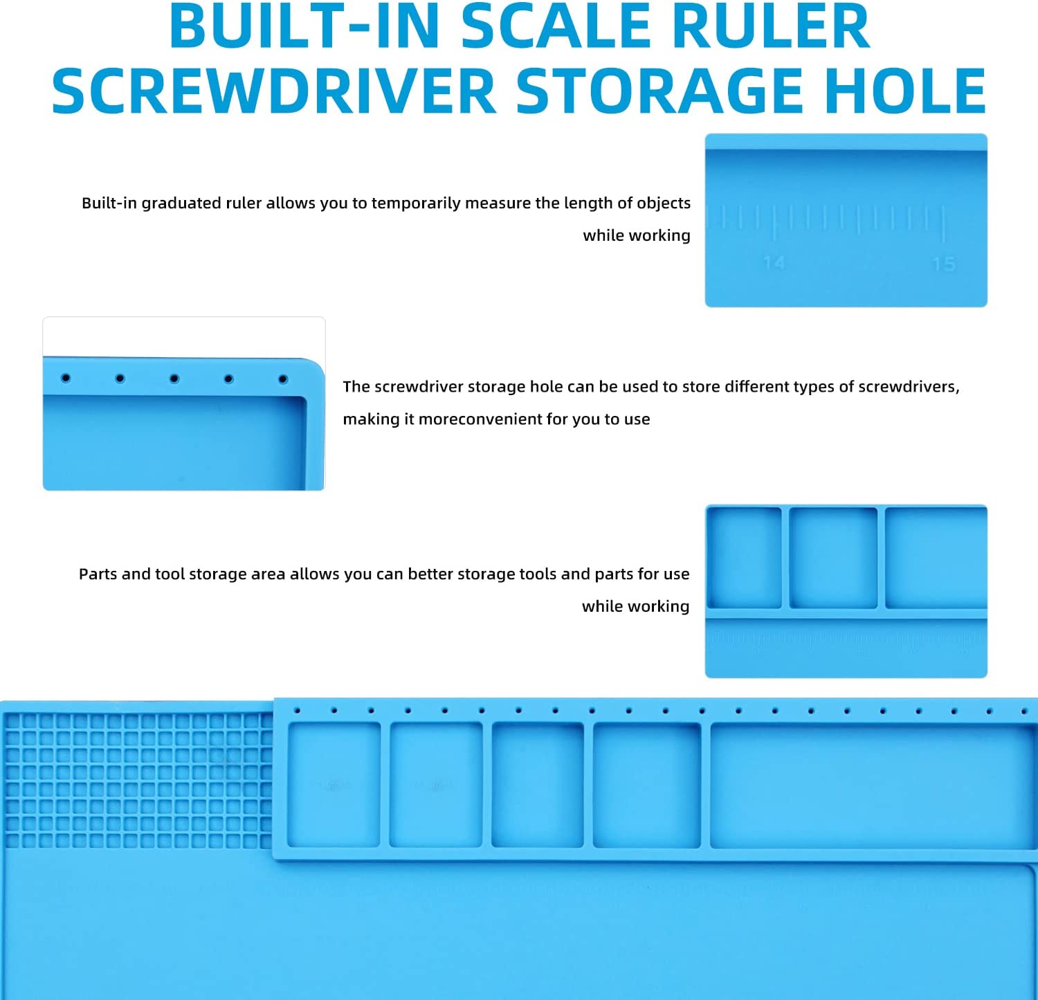 VOTCT Large Silicone Repair Mat Heat Resistant 932℉, Soldering Mat Has Magnetic Area and Multiple Parts Storage Areas For Repair Watch, Phone Other Electronic Product. Light Blue, Size: 17 x 12 Inch