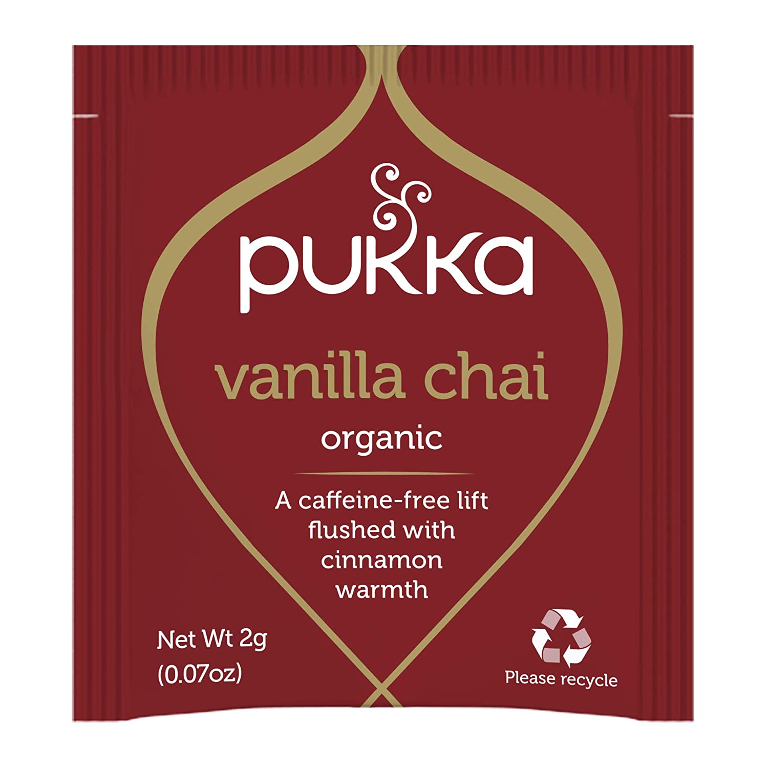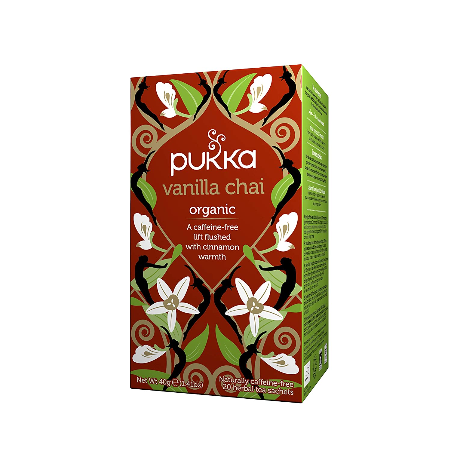 • Pukka Organic Herbal Tea Vanilla Chai, a caffeine-free lift flushed with cinnamon warmth.