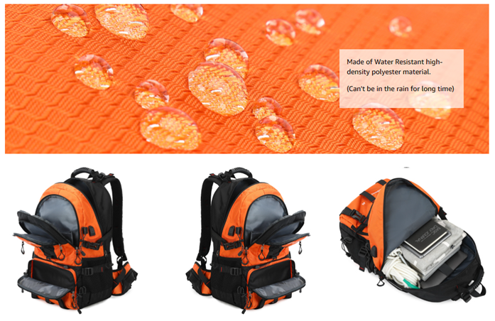 - *Waterproof and durable: including waterproof materials. The Camping Backpack is made of super thick, tear resistant, waterproof and wear-resistant polyester fiber. All stress points are reinforced with joint reinforcement to prolong their service life
