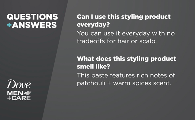 Dove Men+Care Styling Hair Product Aids are engineered specifically for men’s hair, giving it a stronger and more resilient style so that it can keep up with men’s active lifestyles, no matter what the day brings. Dove Men+Care Sculpting Hair Paste creates textured styles with a matte finish that can be reshaped and restyled throughout the day. It's the perfect hair styling product for active men who desire a natural, textured look combined with a medium hold and a matte finish. It provides the finishing touch to a great hair care men's grooming routine so that men can look and feel their best throughout the day. Dove Men+Care Sculpting Paste is designed for daily use and is small enough to travel with you daily. Don’t forget that great hair care starts in the shower! Use the Dove Men+Care Haircare regimen for the best effect. The Control Gel goes well with any of the Dove Men+Care Shampoos and Fortifying 2-in-1 Shampoo + Conditioners, including Thick and Strong Fortifying 2-in-1. Use it with the entire line of Dove Men+Care products for the perfect grooming regimen, such as Dove Men+Care Cool Fresh, Extra Fresh or Clean Comfort Body Wash, Dove Men+Care Dry Spray Antiperspirant, and Dove Men+Care Extra Fresh or Clean Comfort Antiperspirant Stick.
