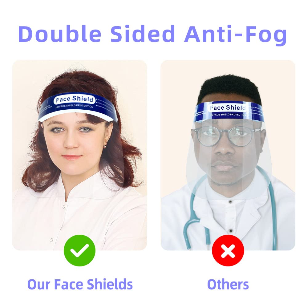 Full Clear Face Shield:Safety face shield for work is coated with anti-fog material,not fog up your glasses when you breathe.double-sided anti-fog effect. The plastic face shield mask covered with the protective films both side, befor use kindly remove them you can see clearly.