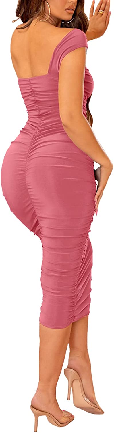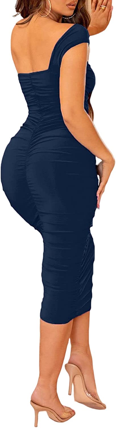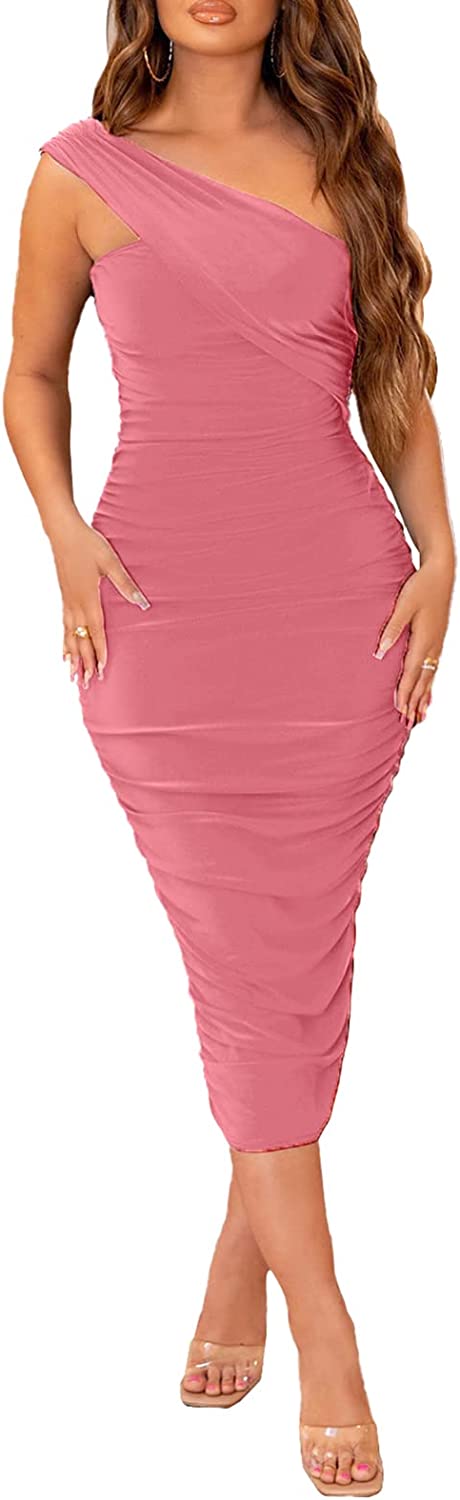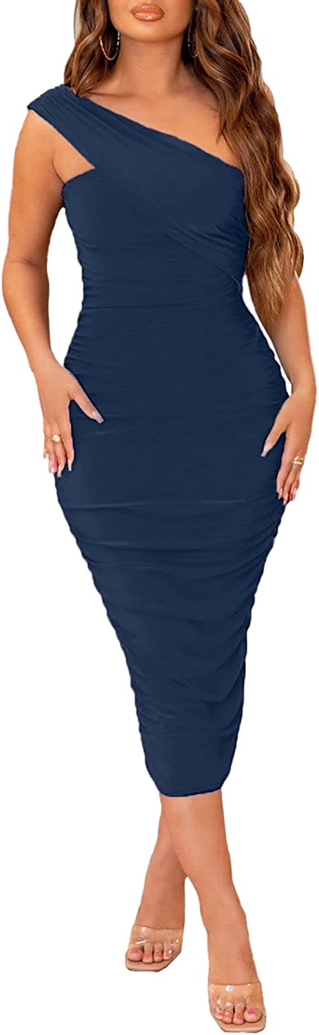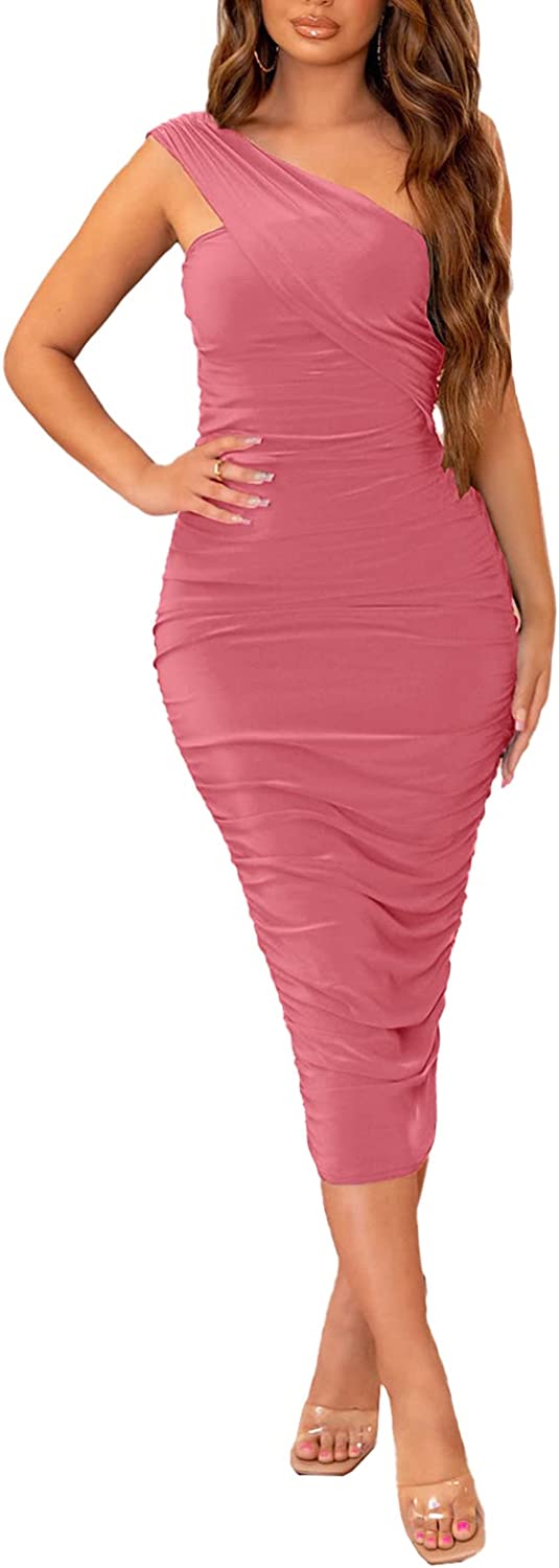 Halfword Sexy One Shoulder Midi Dress for Women Ruched Bodycon Drawstring Night Party Club Cocktail Dresses