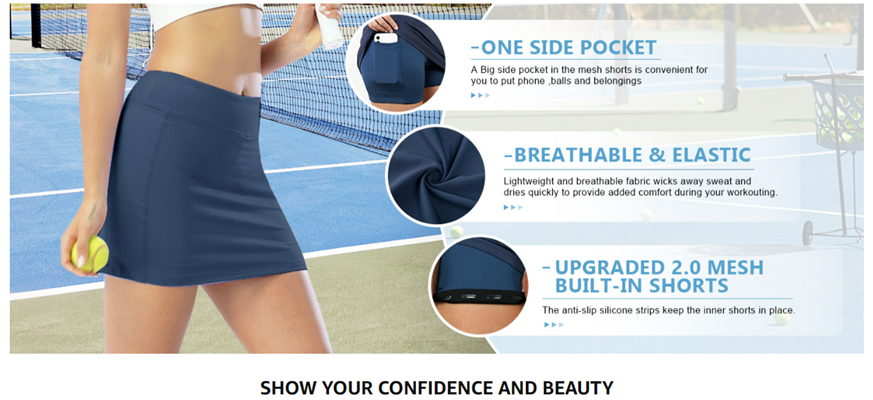 Hight Waist: Tennis Skirt,Elastic waist can hide stomach and stay in place,not roll down at all,so you can enjoy palying tennis.