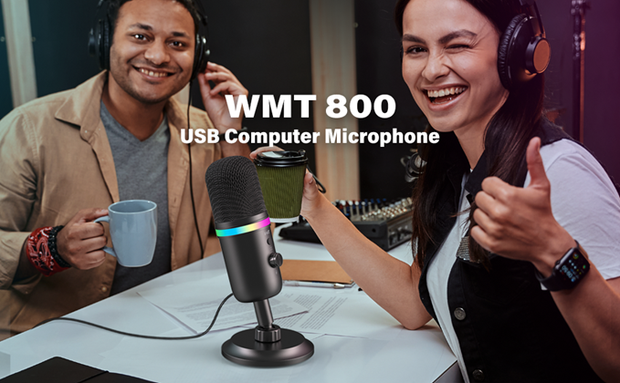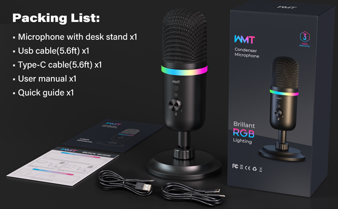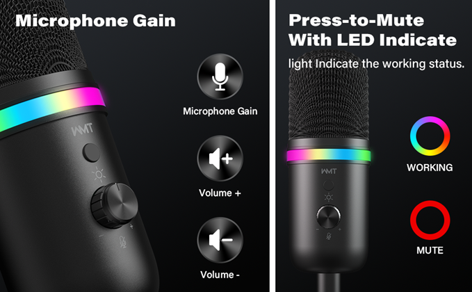 WMT USB Microphone, Condenser Gaming Microphone for PC/MAC/PS4/PS5/Phone- Cardioid Mic with Brilliant RGB Lighting Headphone Output Volume Control, Mute Button, for Streaming Podcast YouTube Discord