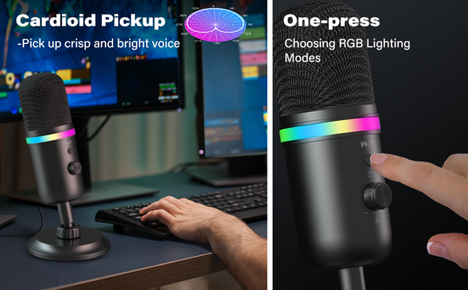 • BRILLIANT AND CONTROLLABLE RGB LIGHTING: The gaming microphone has 12 personalized RGB lighting modes which can be selected with a press of a button. The soft and coordinated light effects will make your video gaming or live streaming more eye-catching and fascinating. You can also choose to turn off the lighting effect!