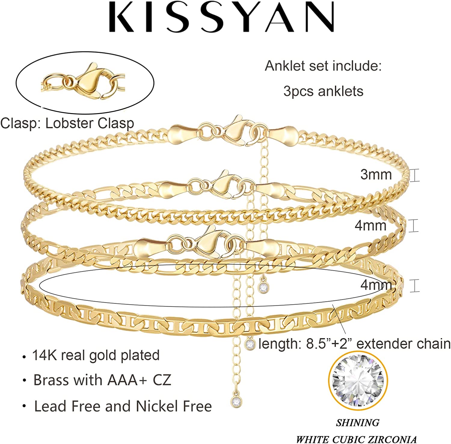 - [Ankle Bracelets for women]: The gold anklets set includes 3pcs, Thin gold cuban link anklet & gold figaro anklet & stud anklet. You can wear it alone or stack.