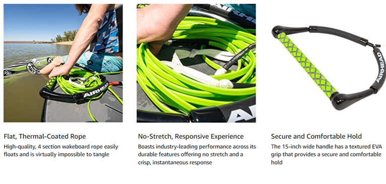 • The wakeboard handle has a 15-inch EVA grip which provides a secure and comfortable hold