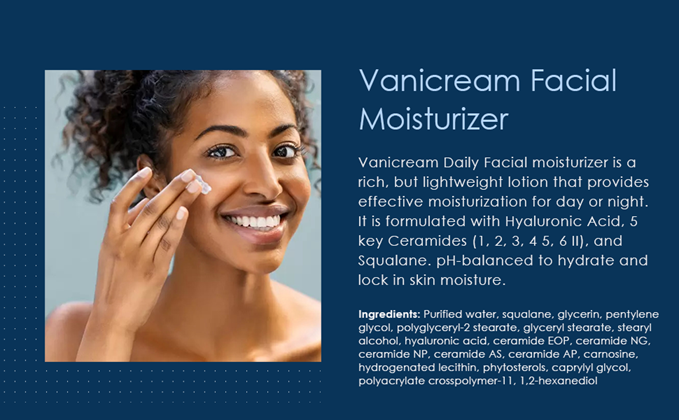 Vanicream Daily Facial moisturizer is a rich, but lightweight lotion that provides effective moisturization for day or night. It is formulated with hyaluronic acid and ceramides to help to hydrate and retain the skin's moisture.
