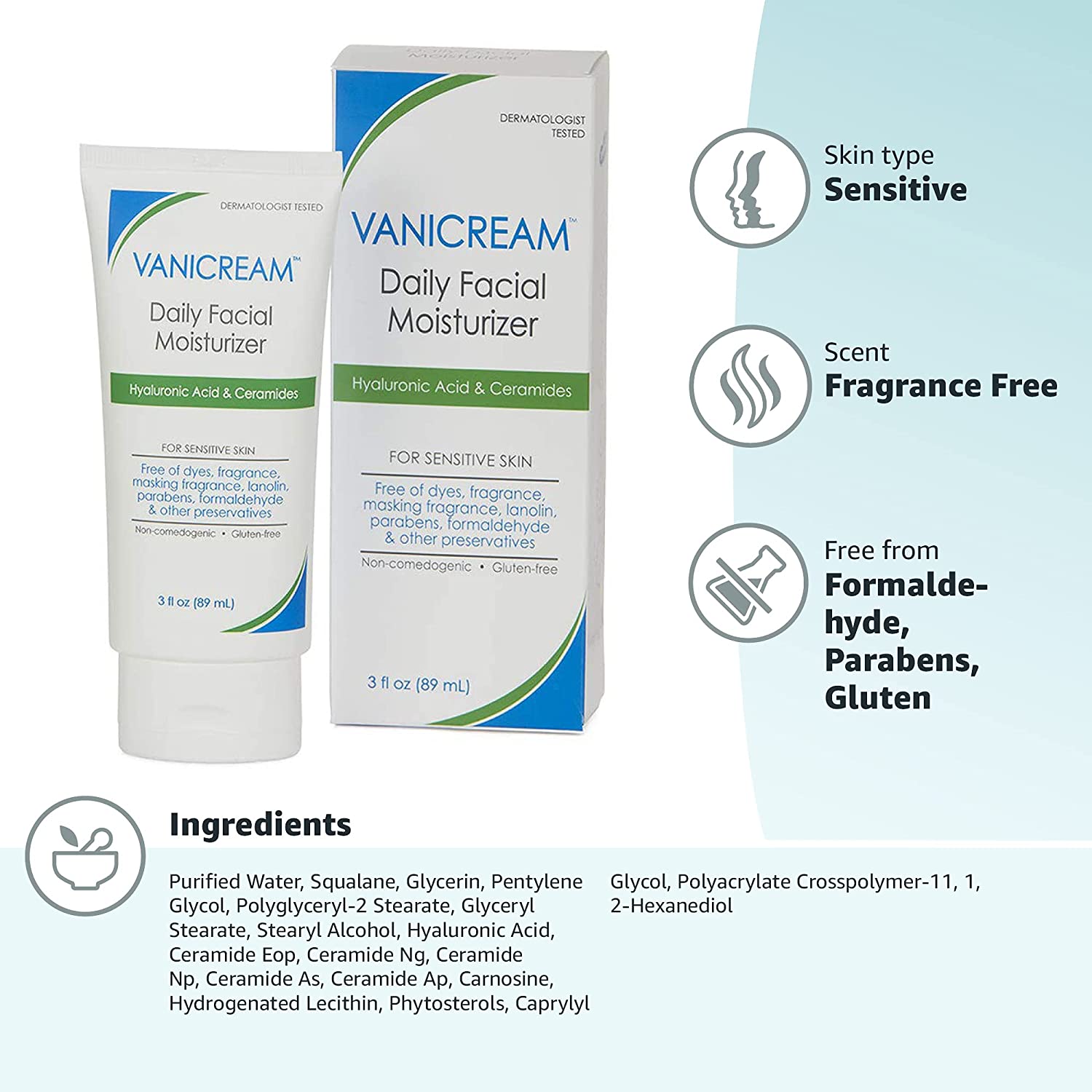 • Sensitive moisturizer: Vanicream fragrance-free daily face moisturizer is a lightweight, gluten-free moisturizer for sensitive skin