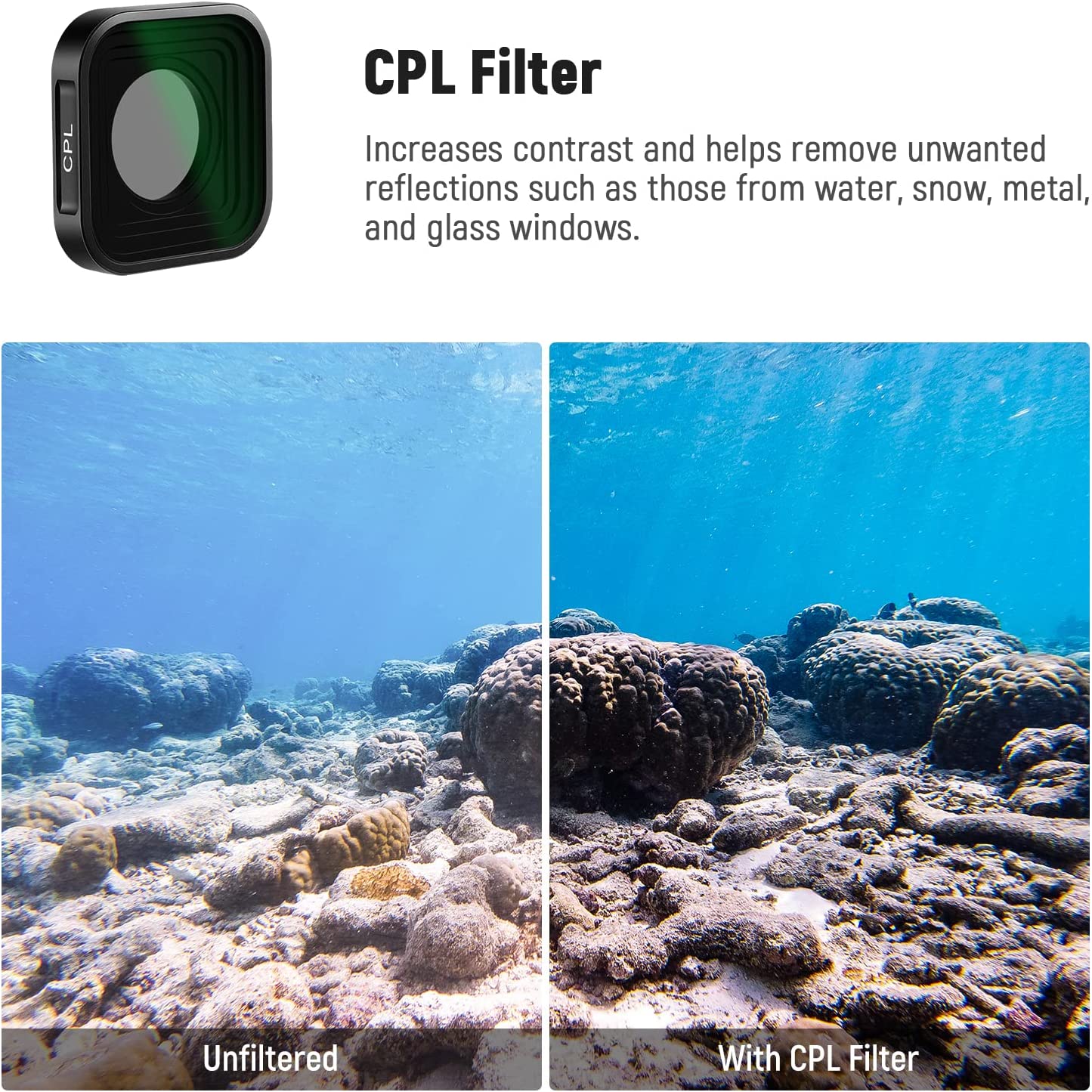- 【Reduce Lens Flare】Neutral density filters reduce light to decrease the chance of overexposure. Polarizer filter increases contrast while eliminating reflection and glare. The CPL Filter is at a preset level and can prevent unnecessary glare from reflecting surfaces (such as water, snow and even glass windows) without rotation.