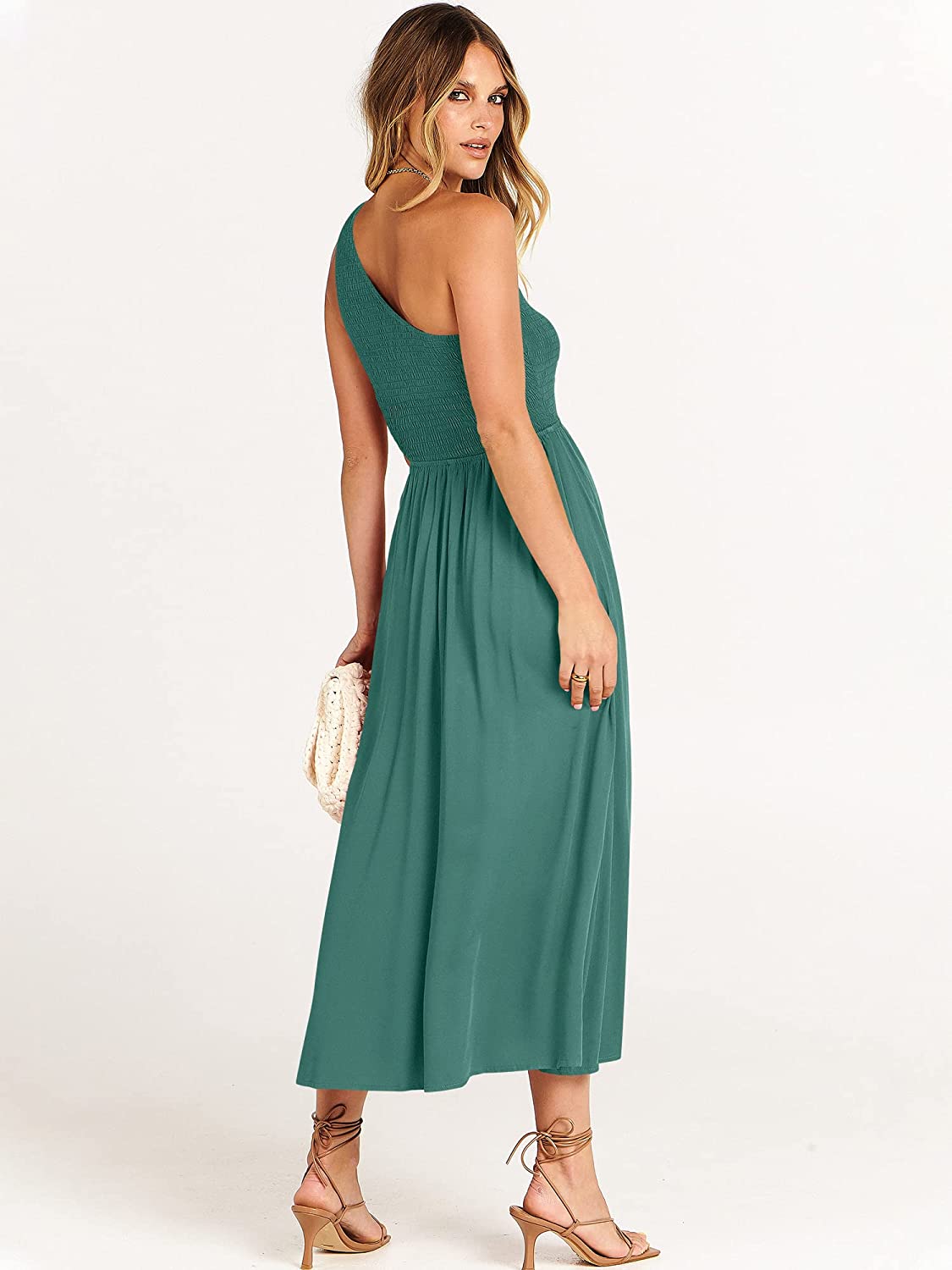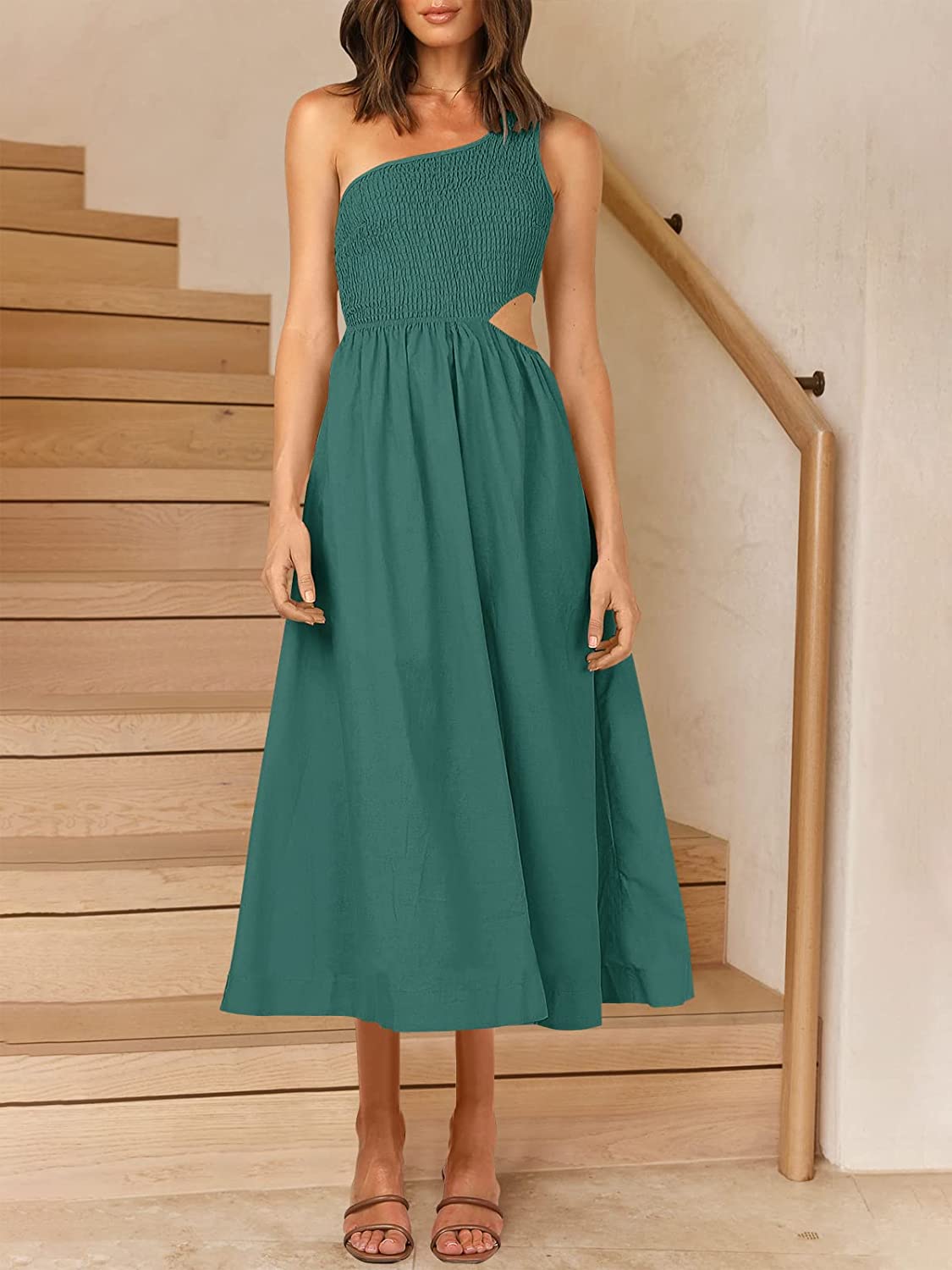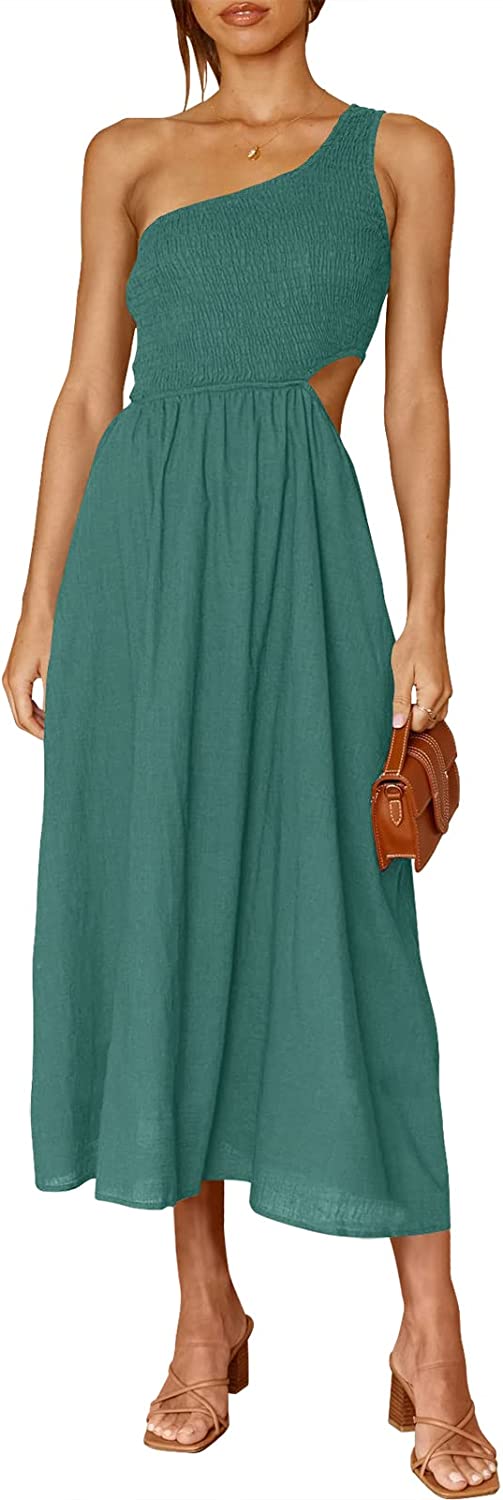 • Features - Sleeveless summer dress,solid color,cutout waist,one shoulder,shirred bodice ,maxi dress,summer beach party dress,super cute flowy long dress.