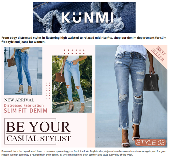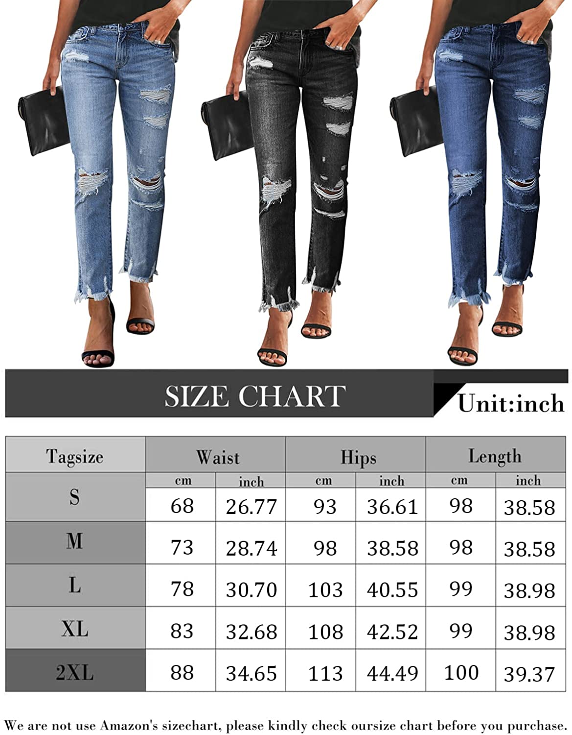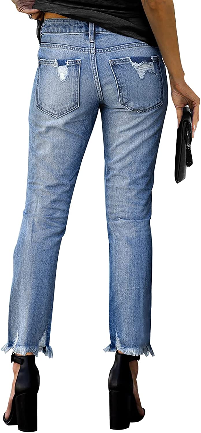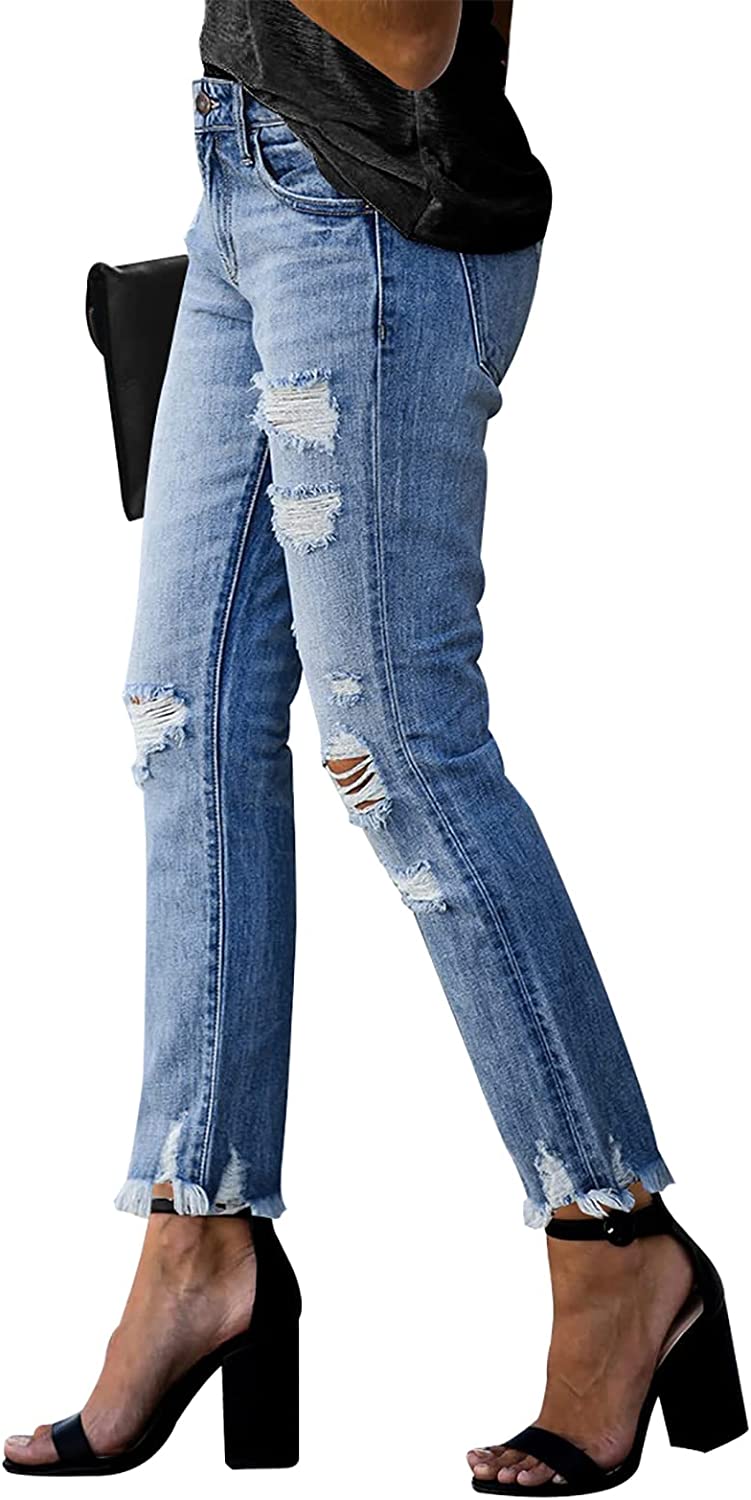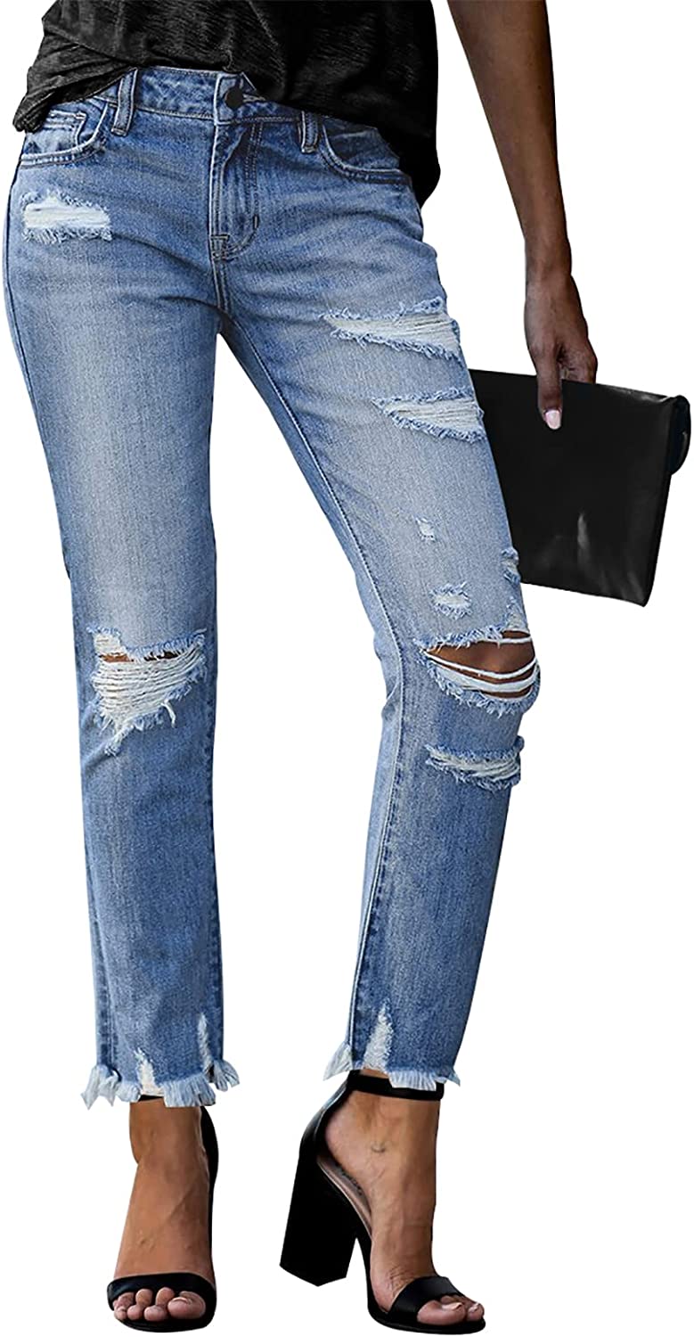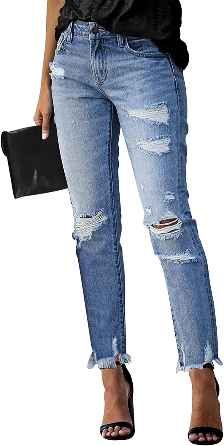 KUNMI Women's Ripped Boyfriend Slim Fit Jeans Frayed Distressed Stretchy Denim Pants