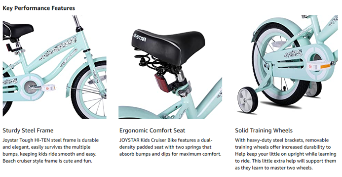 • ELEGANT SIMPLE DESIGN-JOYSTAR Kids Cruiser Bike is the perfect little kids bicycle for cruising the neighbourhood pavements and paths. With a light steel frame and rims the children can cruise up to speed with ease but rest assured that when it's time to pull up fast the combined backpedal rear brake. The kids bike is smooth and easy to pedal making it a fun cruiser for kids to ride.