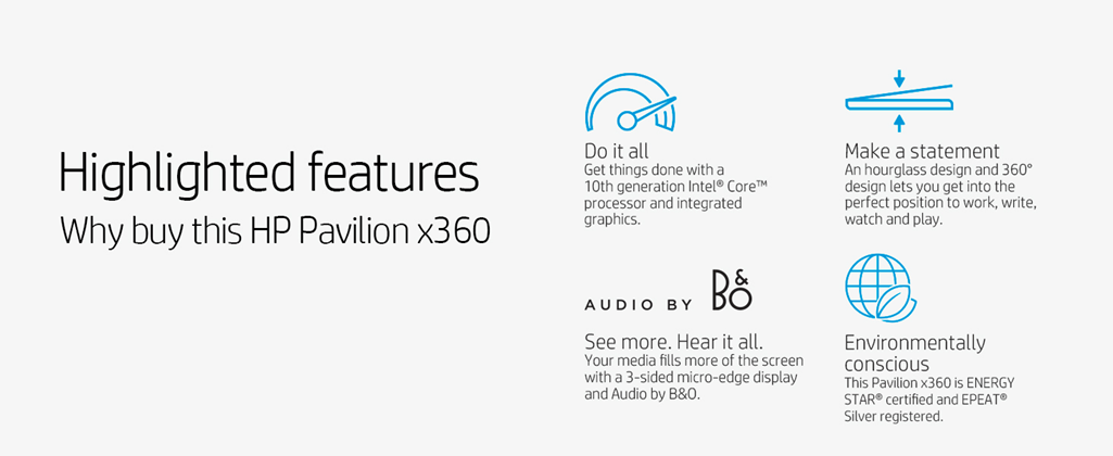 Inspire the world with a reliable laptop that bends over backwards for you. Be free to create, share, and connect in more ways with the new HP Pavilion x360 PC.Keep your day on track when you're away from the office with a smooth wireless experience with Wi-Fi 6 (2x2) and Bluetooth 5 connection—up to 3x faster transfer speeds than Wi-Fi 5. Stay connected to friends, family, coworkers when you're apart with an 88-degree, wide-angle field of view HP Wide Vision HD Camera and integrated dual array microphone for easy video chats and meetings.Innovatively engineered to rotate 360º so that you can use your device in four positions. Work in laptop position, watch in reverse position, play in tent position, and go with tablet position.- Live life without limits with a laptop that gets things done. With a powerful 10th Generation Intel processor, multitasking feels easy and fast.- Stand out with a fresh design that blends unique patterns, tones, and finishes. An hourglass shape and 360-degree hinge lets you open your laptop fast and easy to get into the perfect position to work, write, watch and play.- Write and draw naturally with fluid, more accurate ink strokes. And palm rejection technology prevents unintentional inking and includes reduced lag when writing.- Your photos and videos fill more of the screen with a 3-sided micro-edge display. Experience rich, authentic sound with dual speakers and HP Audio Boost with Audio by B&O.- Your PC's data stays safe from accidental bumps and bruises with HP 3D DriveGuard. It senses motion and locks your spinning hard drive, so a single bump won’t delete your entire digital life.- When you boot up your PC for the first time, get a personal walkthrough during the setup and get an informative overview of your PC’s features.- Our laptop hinges are tested with up to 25,000 openings and closings - that’s an average of seventeen times a day, every day, for four years of worry-free quality.- Easily take this thin and light PC from room to room or on the road. When your PC goes wherever you go, staying productive and entertained has never been easier.- Life can be unpredictable, but your HP laptop shouldn’t be. Backed by over 200 individual tests, our laptops go through it all to deliver durability you can trust and reliability you can count on.