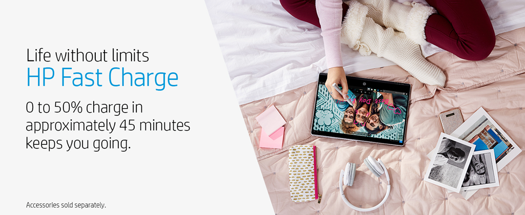 • Battery life: Up to 9 hours and 15 minutes (mixed usage), up to 6 hours and 45 minutes (video playback), up to 9 hours and 45 minutes (wireless streaming); 0 to 50% charge in 45 minutes with HP fast charge