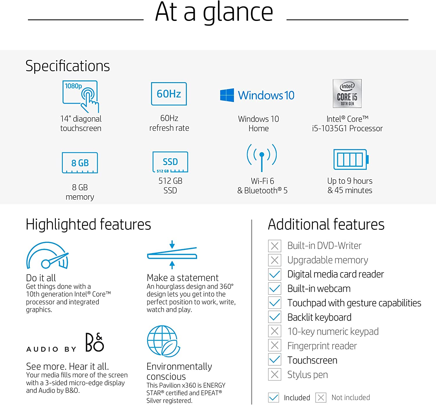• Environmentally conscious: Low halogen, mercury-free display backlights, arsenic-free display glass in this Energy Star(R) certified, Epeat(R) Silver registered HP Pavilion x360 14 Laptops