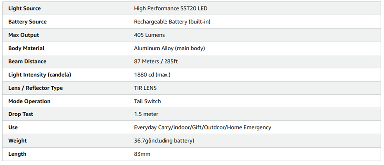 | Specific Uses | Camping, Hiking, Dog Walking, Hunting, Boating, Patrolling, Working, Runing, Power Outages, Emergency, Inspection, Repair |