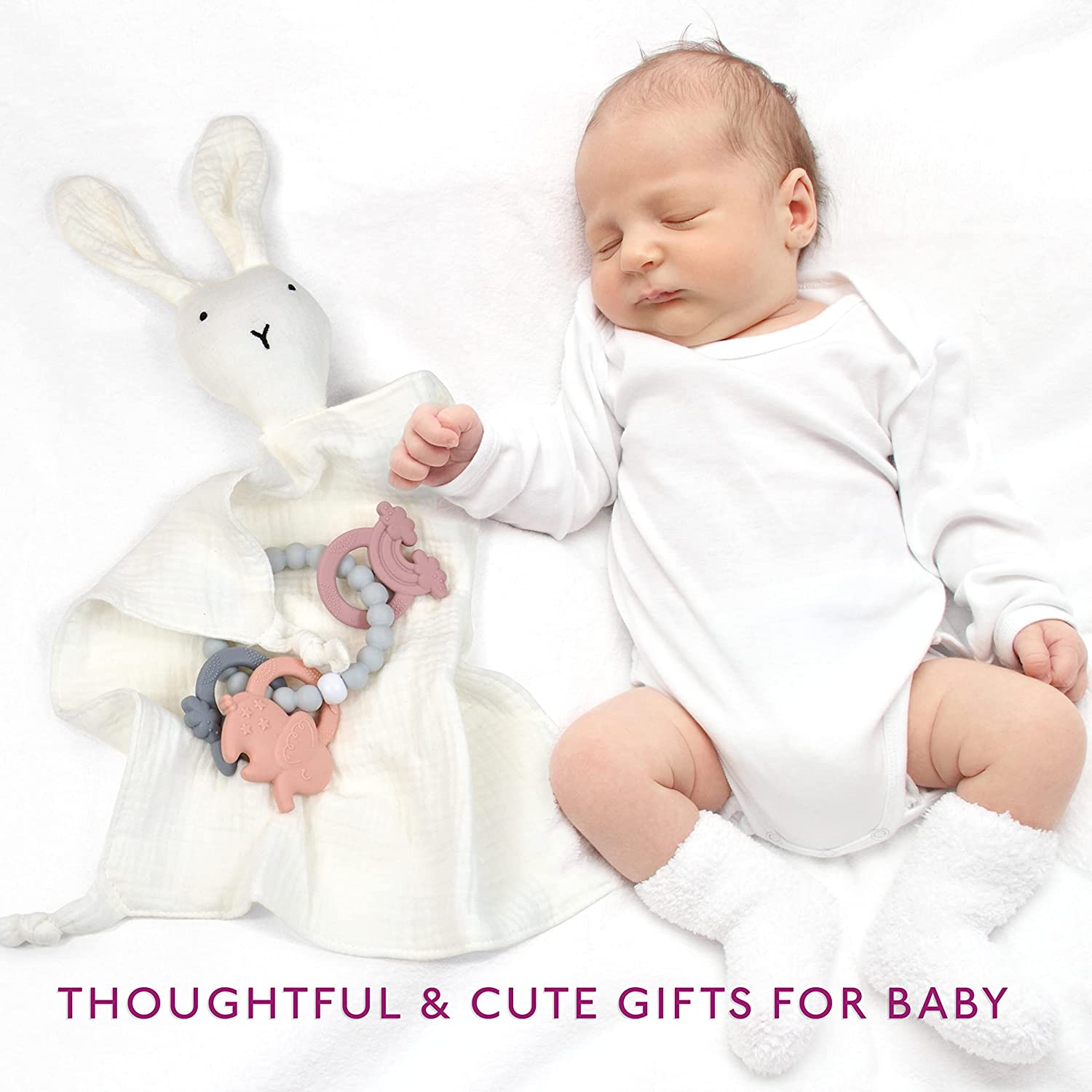 • The baby gifts are both cute and practical. The Bunny Baby Muslin Soother is 100% cotton and free of colour or dyes. The Sensory Teething bracelet is made of food-grade silicone. Ideal baby accessories for newborn.