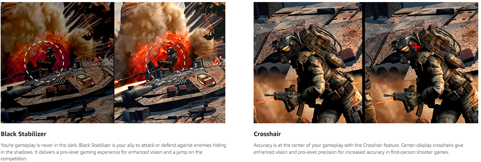 • Dynamic Action Sync helps reduce input lag to help you respond to on-screen action quickly. Black Stabilizer dynamically brightens dark scenes to help you find enemies in the dark. Enhance your accuracy in firefights with the Crosshair feature