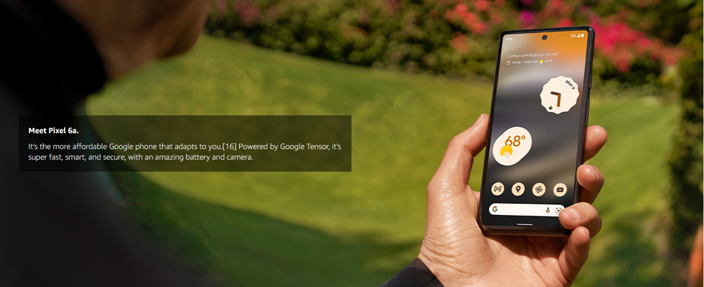 Meet Pixel 6a, the more affordable Google phone that adapts to you.[8] Powered by Google Tensor, it’s super fast and secure, with an amazing battery and camera. And it’s an unlocked Android smartphone, so you can choose the data plan and carrier that work for you.[1] LEGAL [1]Works with all major carriers. 5G service is carrier dependent. Requires a 5G data plan (sold separately). 5G service not available on all carrier networks or in all areas. Contact carrier for details. 5G service, speed and performance depend on many factors, including carrier network capabilities and signal strength. Actual results may vary. Some features not available in all areas. Data rates may apply. See g.co/pixel/networkinfo for info. [2]Estimated battery life based on testing using a median Pixel user battery usage profile across a mix of talk, data, standby, and use of other features. Average battery life during testing was approximately 29 hours. Battery life depends upon many factors and usage of certain features will decrease battery life. Battery testing conducted in California in early 2022 on pre-production hardware and software, using default settings. Battery testing conducted using Sub-6 GHz non-standalone 5G (ENDC) connectivity. Actual battery life may be lower. [3]Requires Google Photos app. Magic Eraser may not work on all image elements. [4]Wired charging rates up to 18W based on use of Google 30W USB-C® or Google 18W USB-C® Charger plugged into a wall outlet. Actual results may be slower. Adapters sold separately. Compatible with USB PD 3.0 PPS adapters. [5]Not available in all languages or countries. Not available on all media or apps. See g.co/pixel/livetranslate for more information. Translation may not be instantaneous. 3Your Pixel will receive feature drops during the applicable Android update and support periods for the phone. See g.co/pixel/updates for details. [6]Internet connection required during setup only. [7]Designed to comply with dust and water protection rating IP67 under IEC standard 60529 when each device leaves the factory but the device is not water or dust proof. The accessories are not water or dust resistant. Water resistance and dust resistance are not permanent conditions and will diminish or be lost over time due to normal wear and tear, device repair, disassembly or damage. Dropping your device may result in loss of water/dust resistance. Liquid damage voids the warranty. See g.co/pixel/water for details. [8]Compared to Pixel 5a. [9]Deblurring may not work on all photos or videos with faces. [10]Some third party apps and data may not be transferred automatically. Visit g.co/pixel/copydatahelp for information. [11]Measured diagonally; dimension may vary by configuration and manufacturing process. Smooth Display is not available for all apps or content. Smooth Display automatically adjusts to optimize for best viewing and battery performance. [12]Measured diagonally; dimension may vary by configuration and manufacturing process. [13]Maximum resolution and field of view with RAW image files setting turned on. Setting is turned off by default. See g.co/pixel/photoediting for more information. [14]Storage specifications refer to capacity before formatting. Actual formatted capacity will be less. [15]Your Pixel will receive feature drops during the applicable Android update and support periods for the phone. See g.co/pixel/updates for details. [16]Compared to MSRP of Pixel 6. [17]See g.co/pixel/astrophotography for details.
