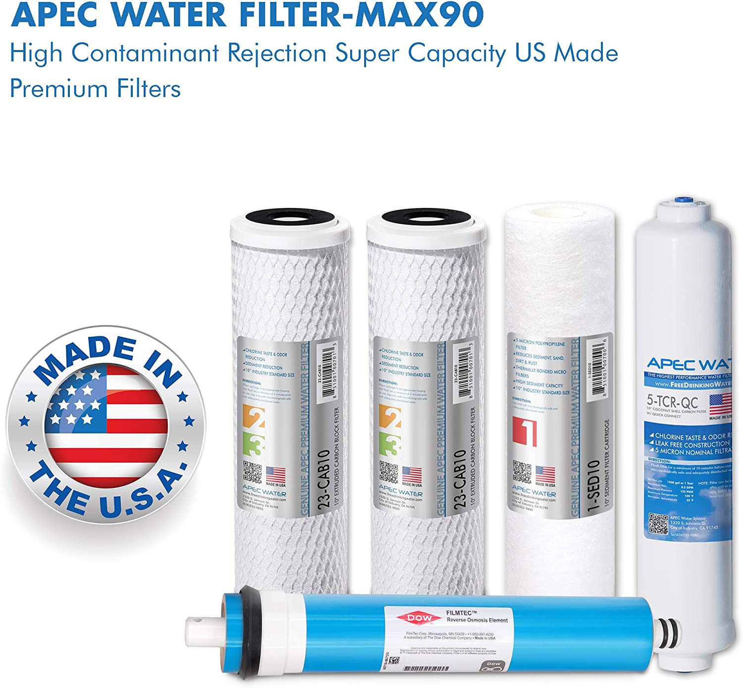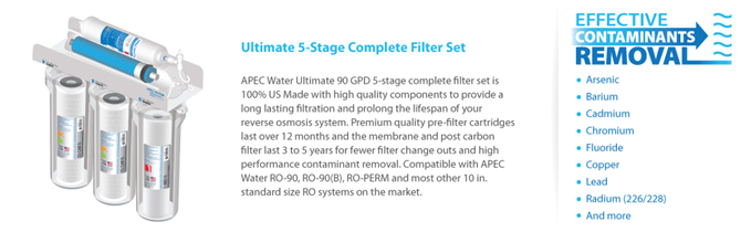 APEC Ultimate high flow 5-stage complete filter set is made in USA with the highest quality filtration components to provide a longer lasting filter set to protect and prolong the lifespan of your Reverse osmosis system. Premium quality pre-filter cartridges lasts over 12 months while the membrane and post carbon filter last 3-5 years for fewer filter change outs and high performance impurity removal. Compatible for APEC RO-90, RO-PERM, and all other standard size under counter 50-90 GPD RO systems on the market.