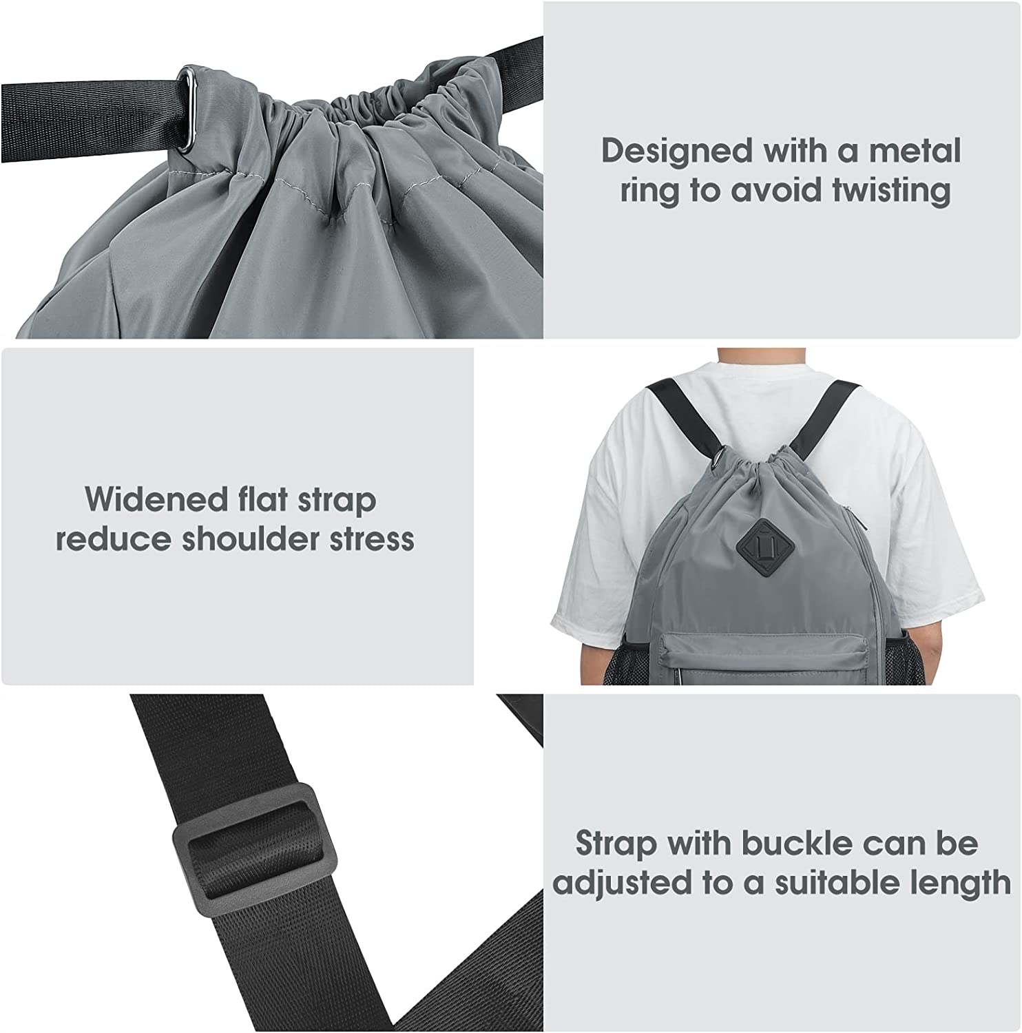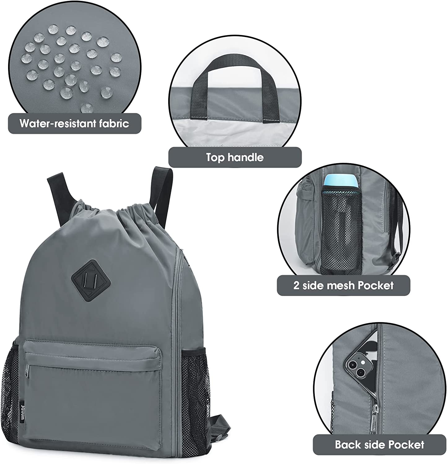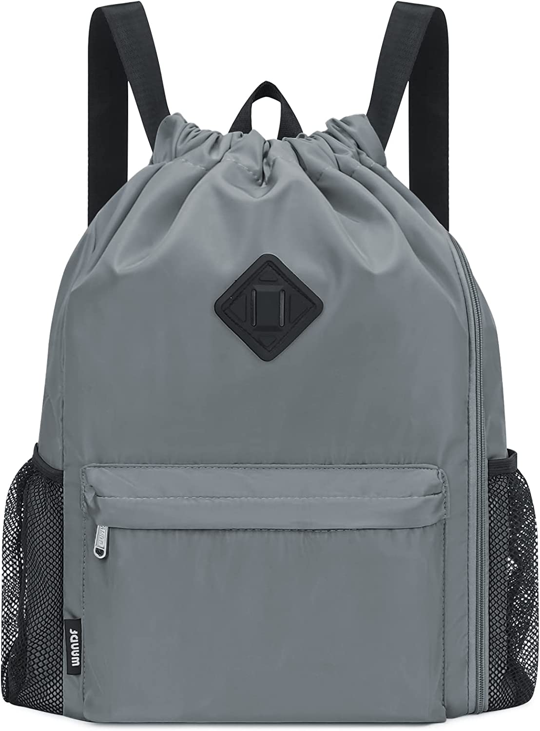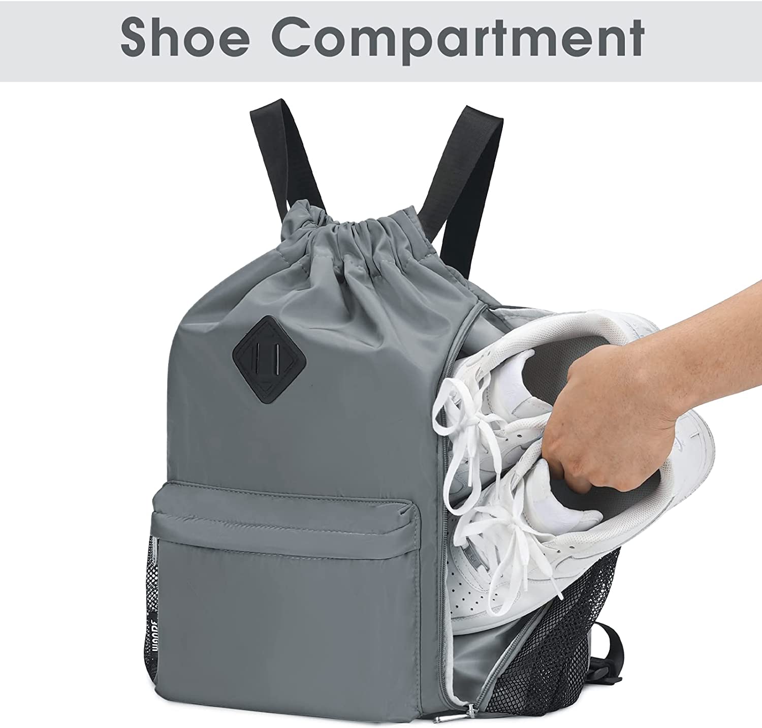 WANDF Drawstring Backpack Sports Gym Bag with Shoes Compartment, Water-Resistant String Backpack Cinch for Women Men(Large,Grey)
