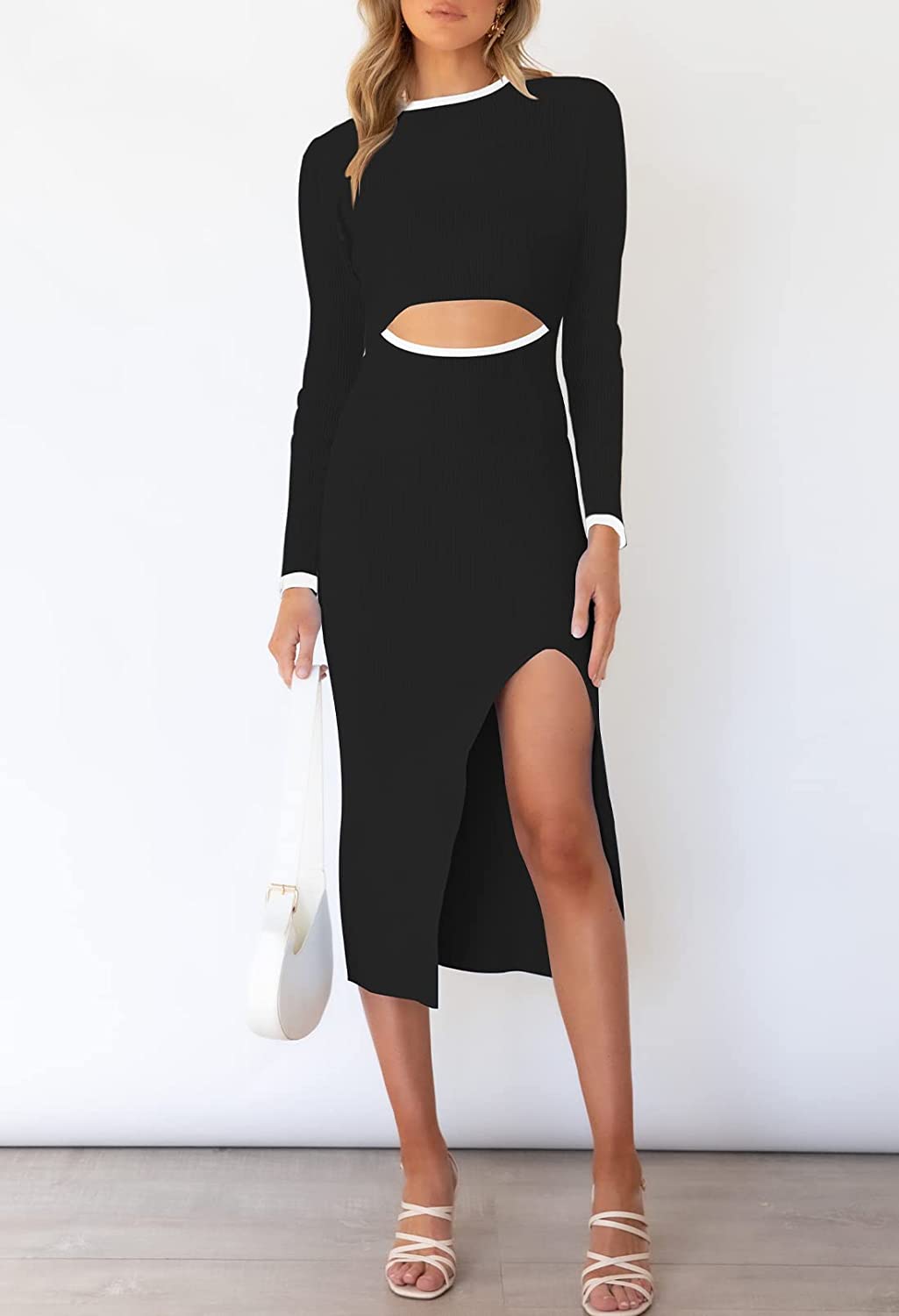 Long sleeve bodycon knit midi dress features crew neck, one side slit, ribbed, slimming hollow out dress