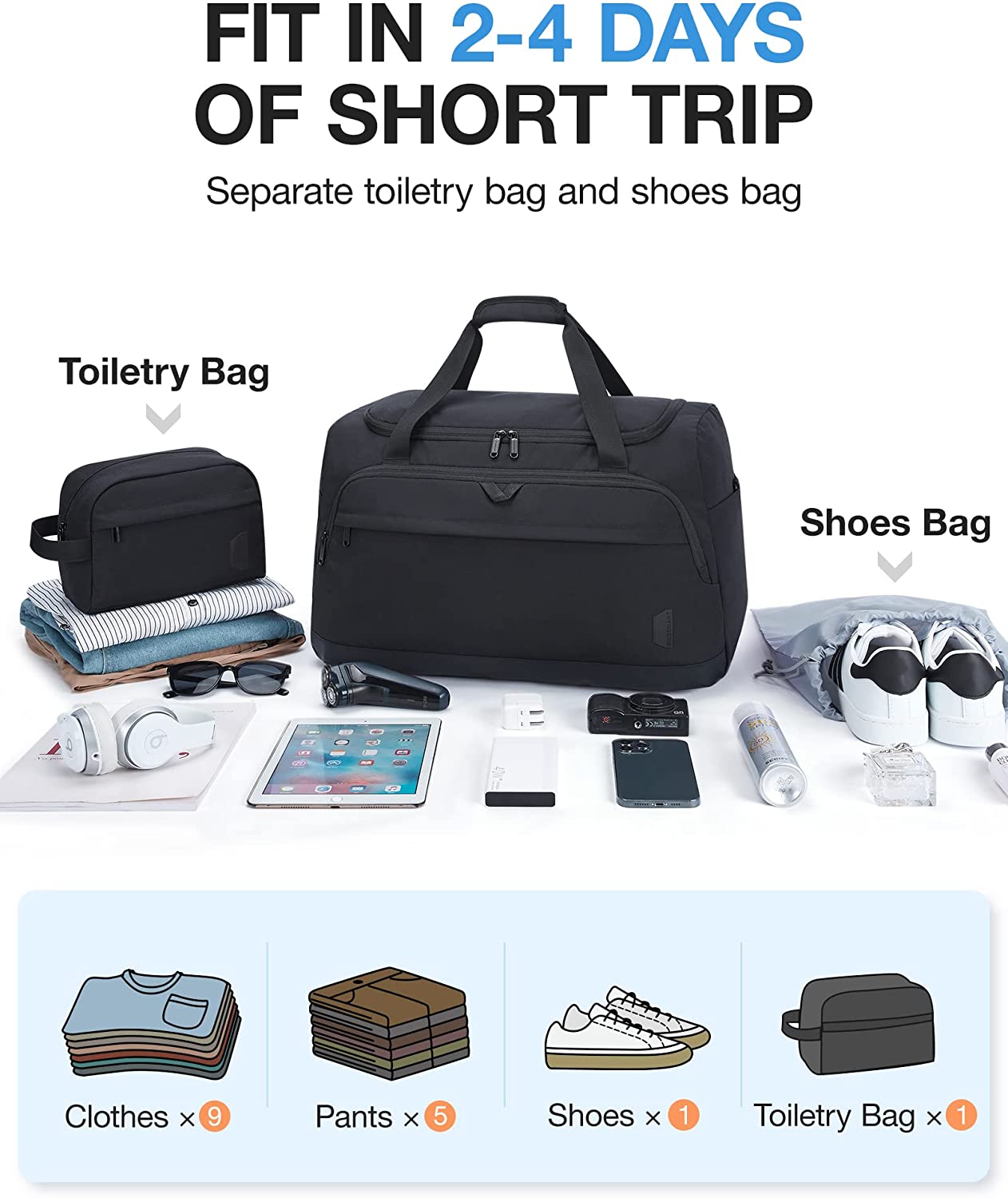 • Large Capacity & Lightweight: Carry on bag 38L capacity can fit in 2-4 days short trip of daily essentials. The overnight bag made of high-quality water-resistant fabric, durable and lightweight. Weighs only 1.6 lbs.