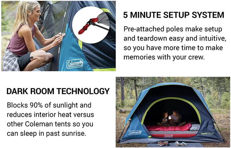 • DARK ROOM TECHNOLOGY: Blocks 90% of sunlight so you can sleep in past sunrise; reduces heat (vs. a comparable Coleman tent) for a more comfortable rest anytime of day