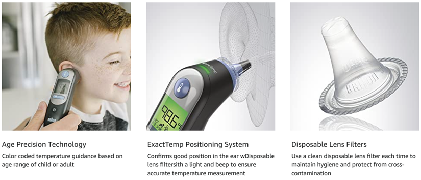 - SANITARY SHARING – It’s not just a baby thermometer for infants, this gentle Braun thermometer can be used for the whole family. The disposable ear thermometer covers/lens filters make sharing sanitary.