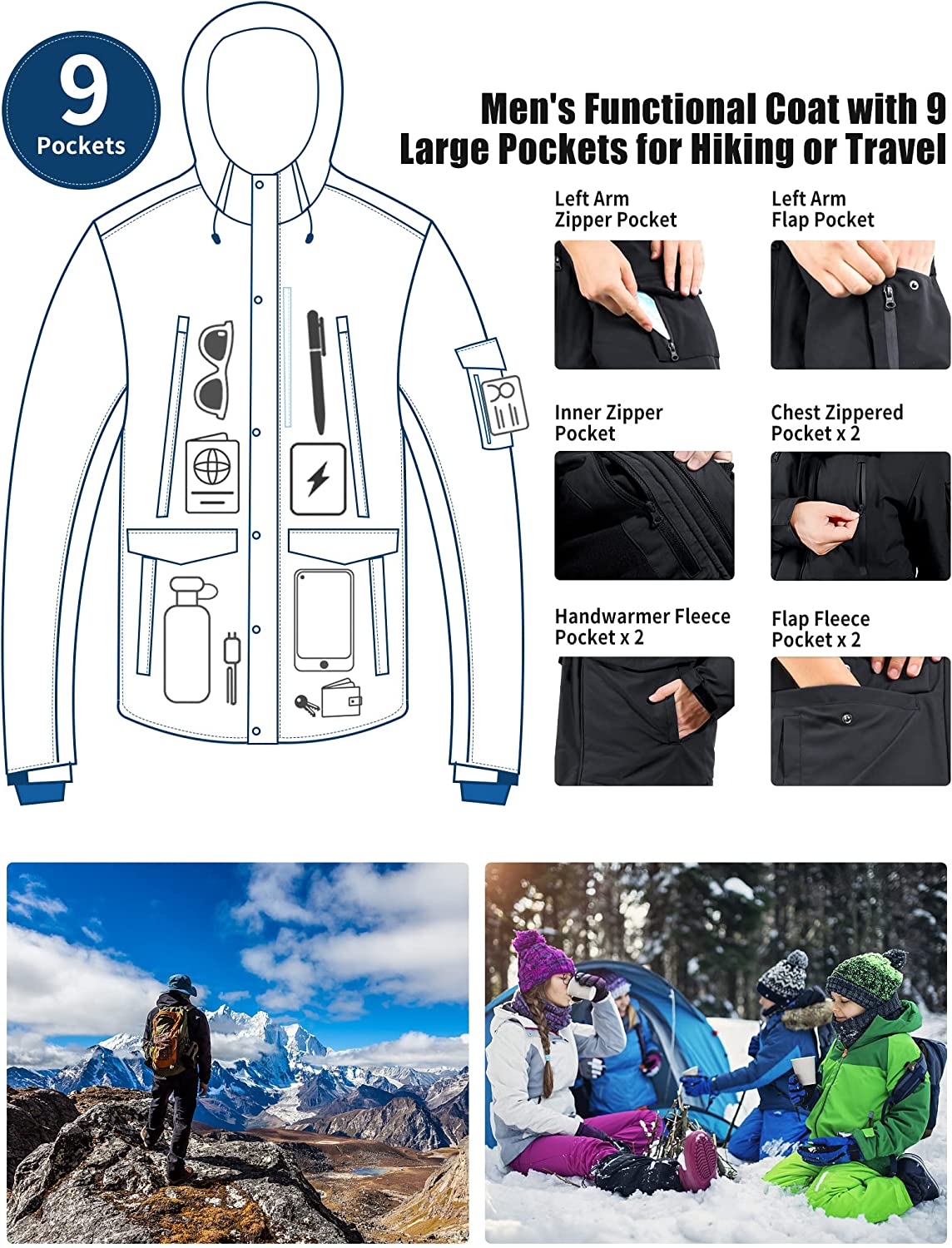 • 9 Practical Pockets : This overall winter coat for men has 9 pockets. 2 sides 4 fleece pockets keep your hands warm in the cold winter, 2 chest zip pockets and 2 small arm pockets that you can use to put your credit card,phone,wallet,passport and other accessories. 1 lined inside pocket can be used to store your phone. How practical design.