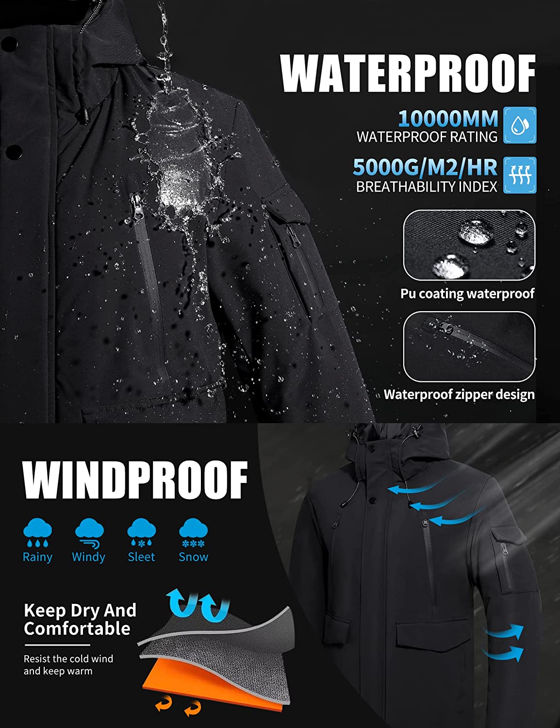 • Waterproof & Windproof: Winter coats for men is made of waterproof coated fabric, pocket zippers are also waterproof, ski, you don't worry about getting wet in the rain. The extreme cold weather jacket and hood drawstring turtleneck provides all-around wind protection, keeping you warm and helping you fto ight bad rainy or misty weather.