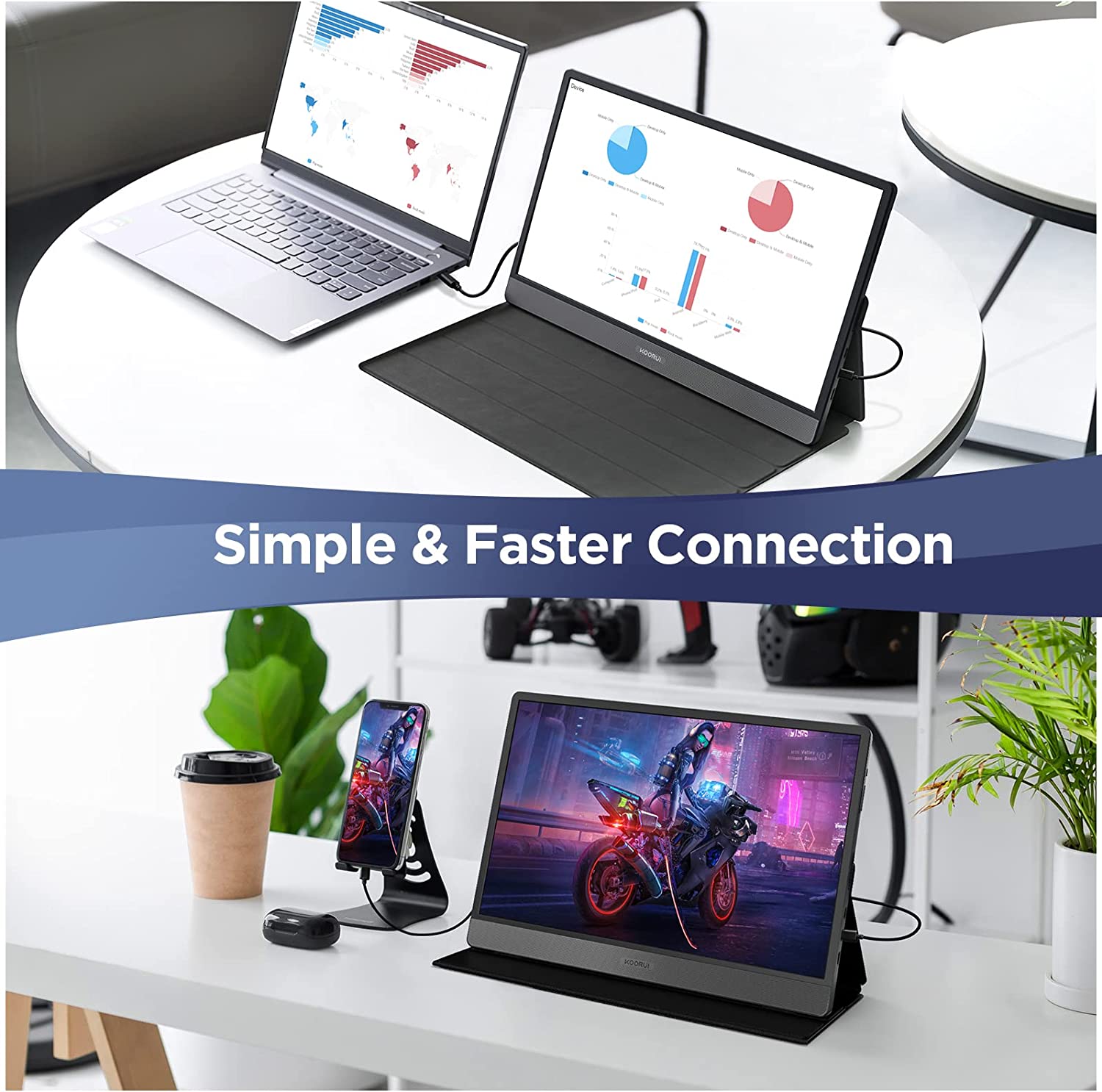 • WIDE COMPATIBILITY - KOORUI usb portable monitor is easily connect laptop, PC, MAC, tablet, smart phones, Switches, etc via Type-c or Mini HDMI port, great ideal for extending your screen or playing games on business trip, travel, or home entertainment.