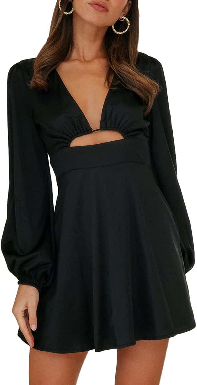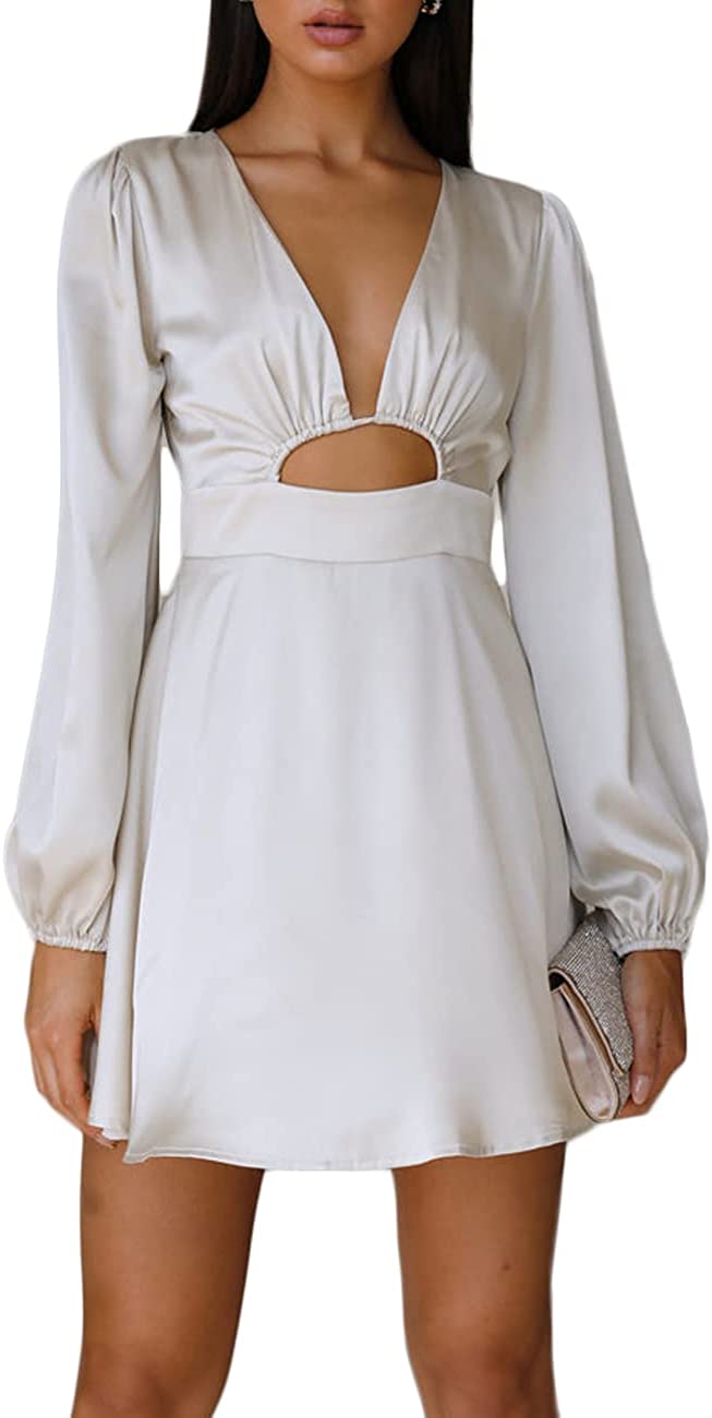Front Cut Out Deep V Neck Satin Mini Dress Wedding Guest- Lantern Long Sleeve A-line Silk Short Swing Skater Sundress Club