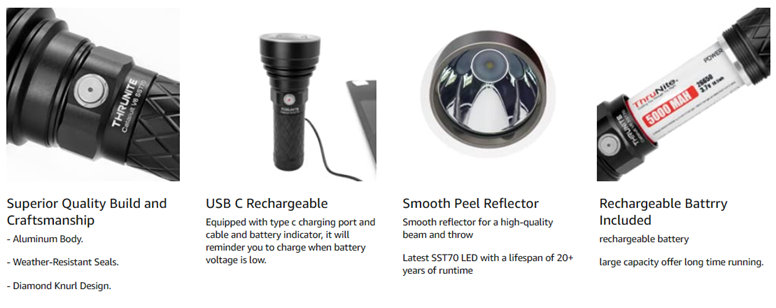 | Included Components | Holster*1,O-rings*2, Lanyard*1, THRUNITE battery*1, USB C Charging Cable*1, USB Rubber Cover*2, Side Switch Cap*1 |