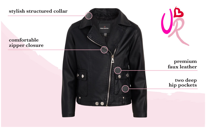 • OFFICIALLY LICENSED URBAN REPUBLIC: Girls' Faux Leather Moto Jacket; Inspired by a new upcoming generation, fast-paced culture, and diverse self-expression