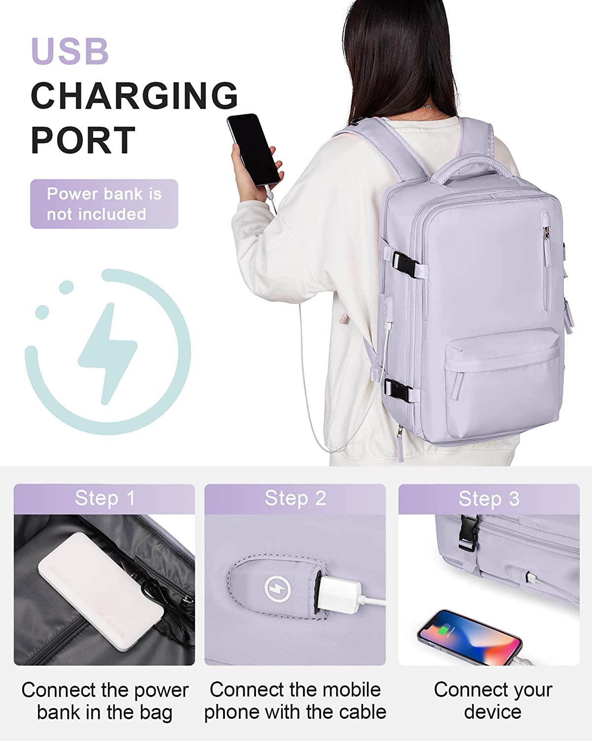 Laptop backpack USB interface:With external built-in USB charger and internal built-in charging cable, this USB backpack provides you a more convenient way to charge your phone, ipad and laptop. Please note that this backpack does not include the power bank itself, the USB charging port only provides convenient charging.