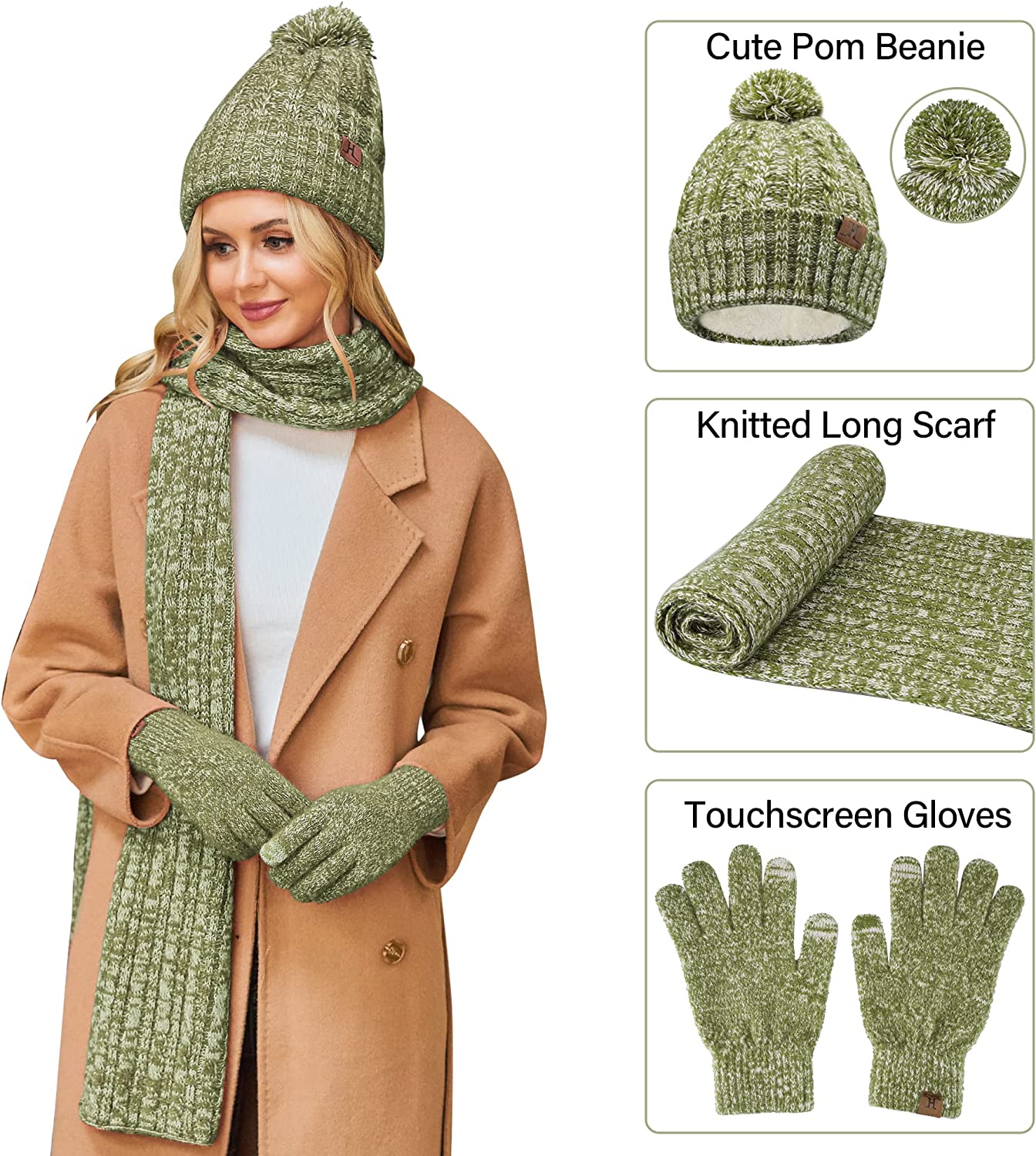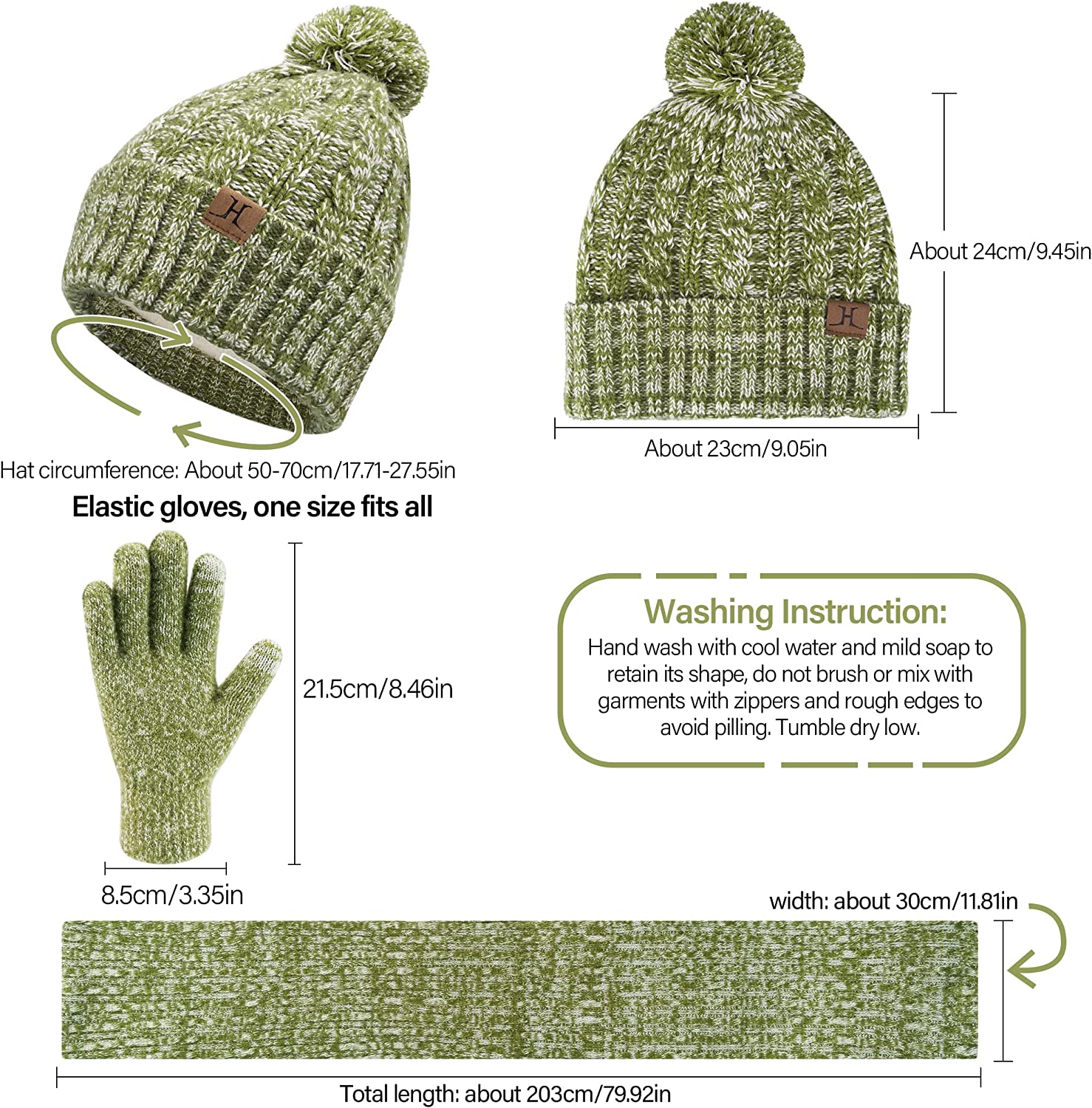 Womens Winter Warm Beanie Hat Touchscreen Gloves Long Scarf Set Ribbed Cable Knit with Fleece Lined Skull Pom Caps