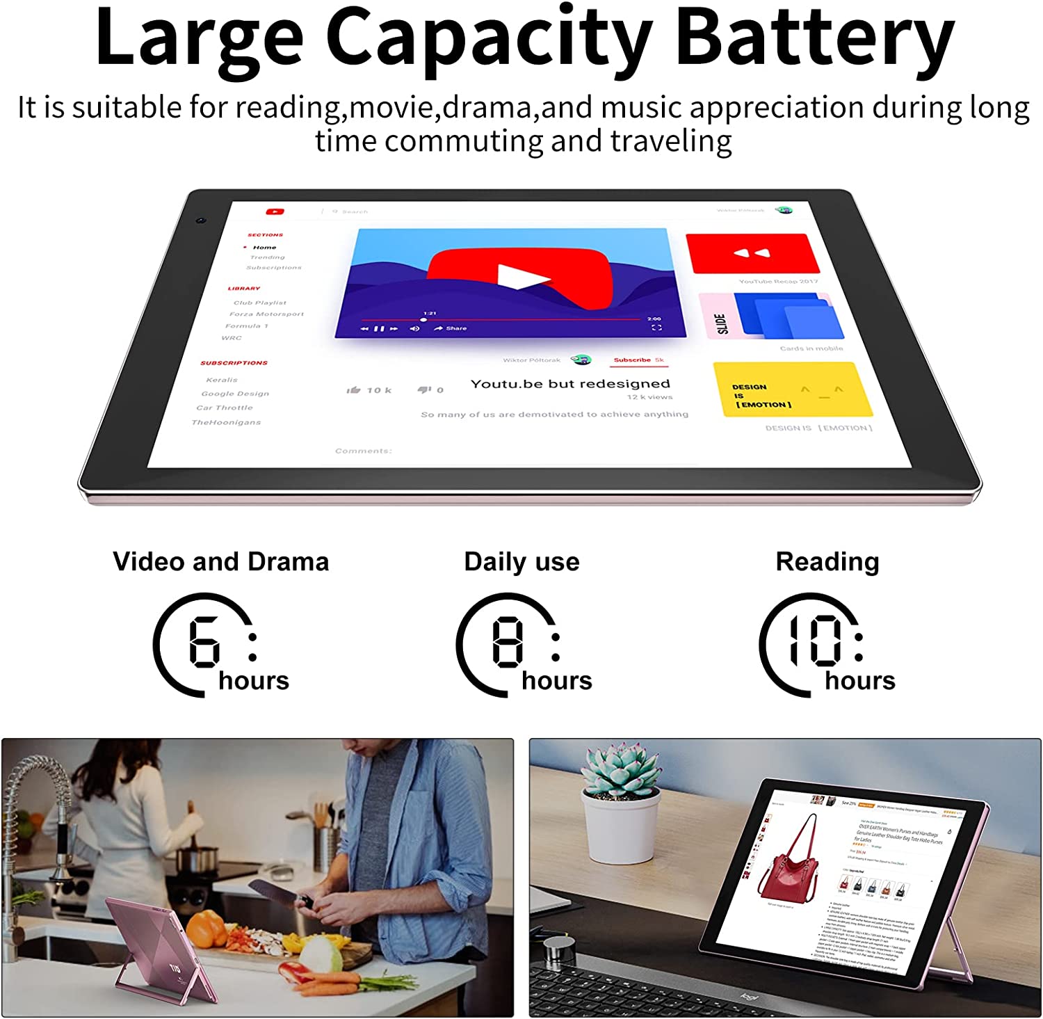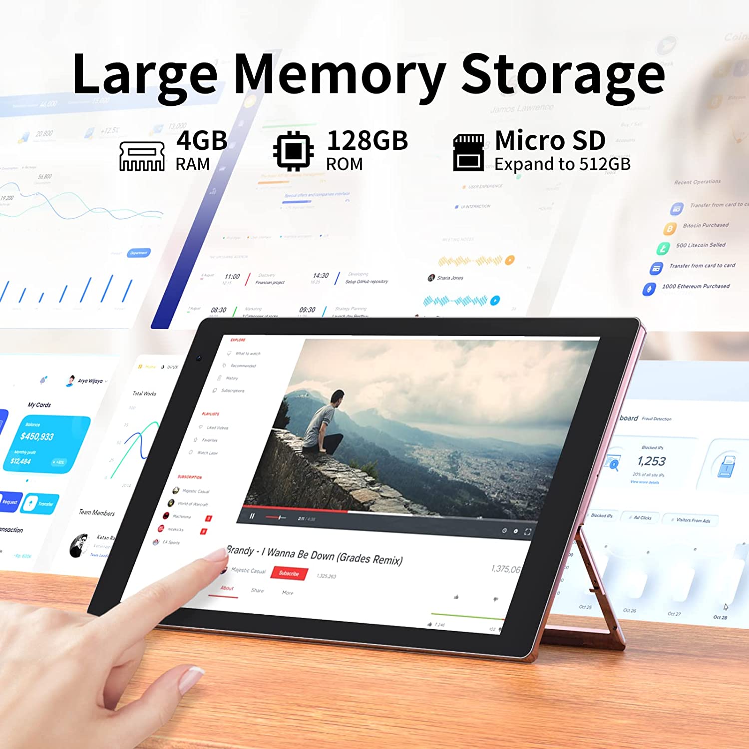 • Large Capacity Battery & Great Entertainment - Equipped with a 128GB ROM storage that support most 512GB expand perfect for student, writer, kids. 6000mAh built-in rechargeable battery enables about 8 hours mixed-use of reading e-books, Listening music, watching movies, playing games, or browsing website, This tablet will be a perfect choice.