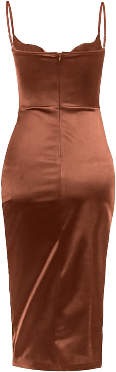 Joukavor Women's Sexy Spaghetti Strap Satin Dress Ruched Midi Bodycon High Slit Dress for Cocktail