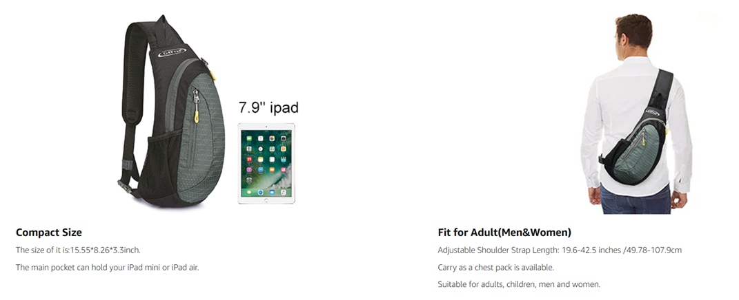 Ideal Applications; This sling bag is fashion (bright and vibrant color, cute and good quality), casual (keep your hands free and avoid a bulky backpack), and outdoor sports (walking, hiking, camping, climbing, running, cycling, bike riding), travel vacation, trips to the amusement park or so on. An indispensable mini backpack for your necessities