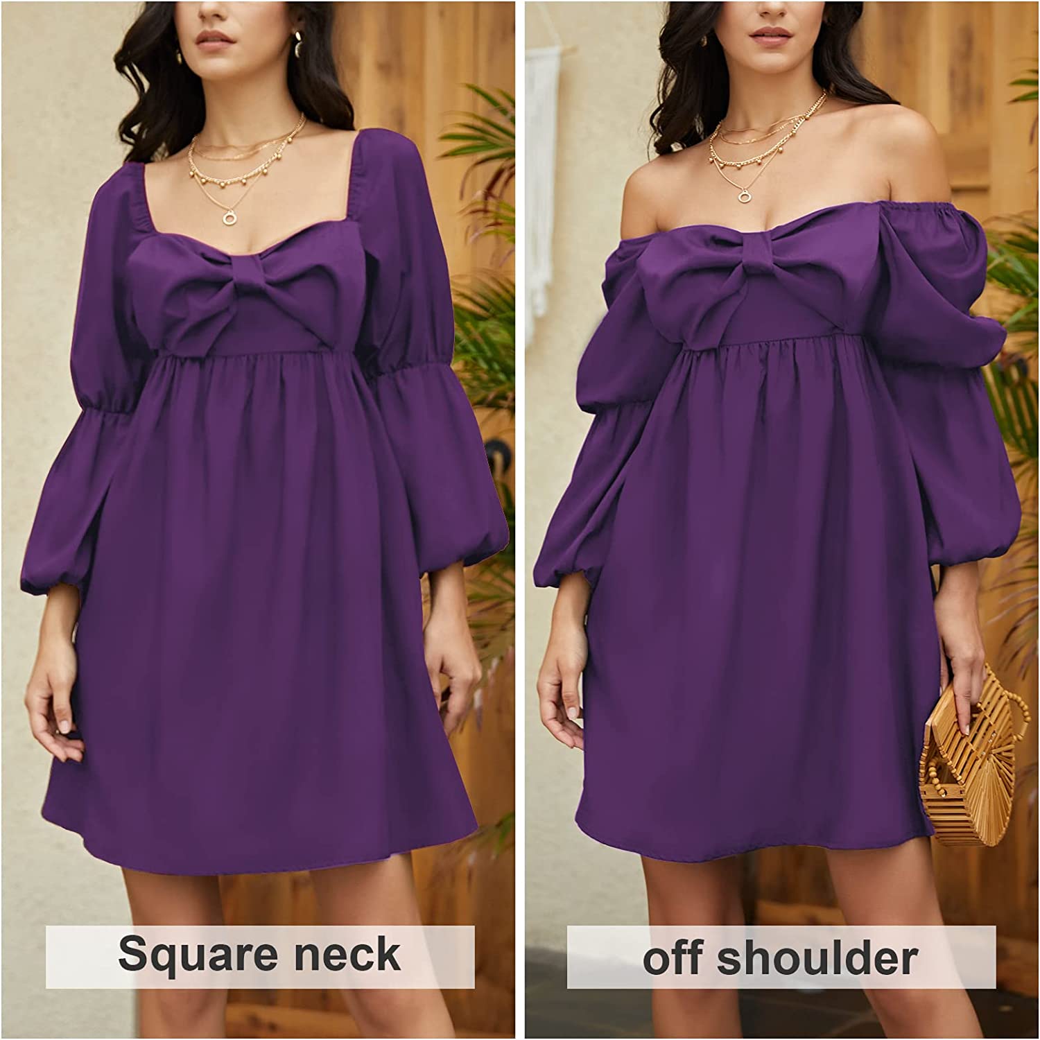 EXLURA Womens Summer Casual Wedding Guest Dress Square Bow Neck Long Puff Sleeve Dress Empire Waist Babydoll Mini Dress