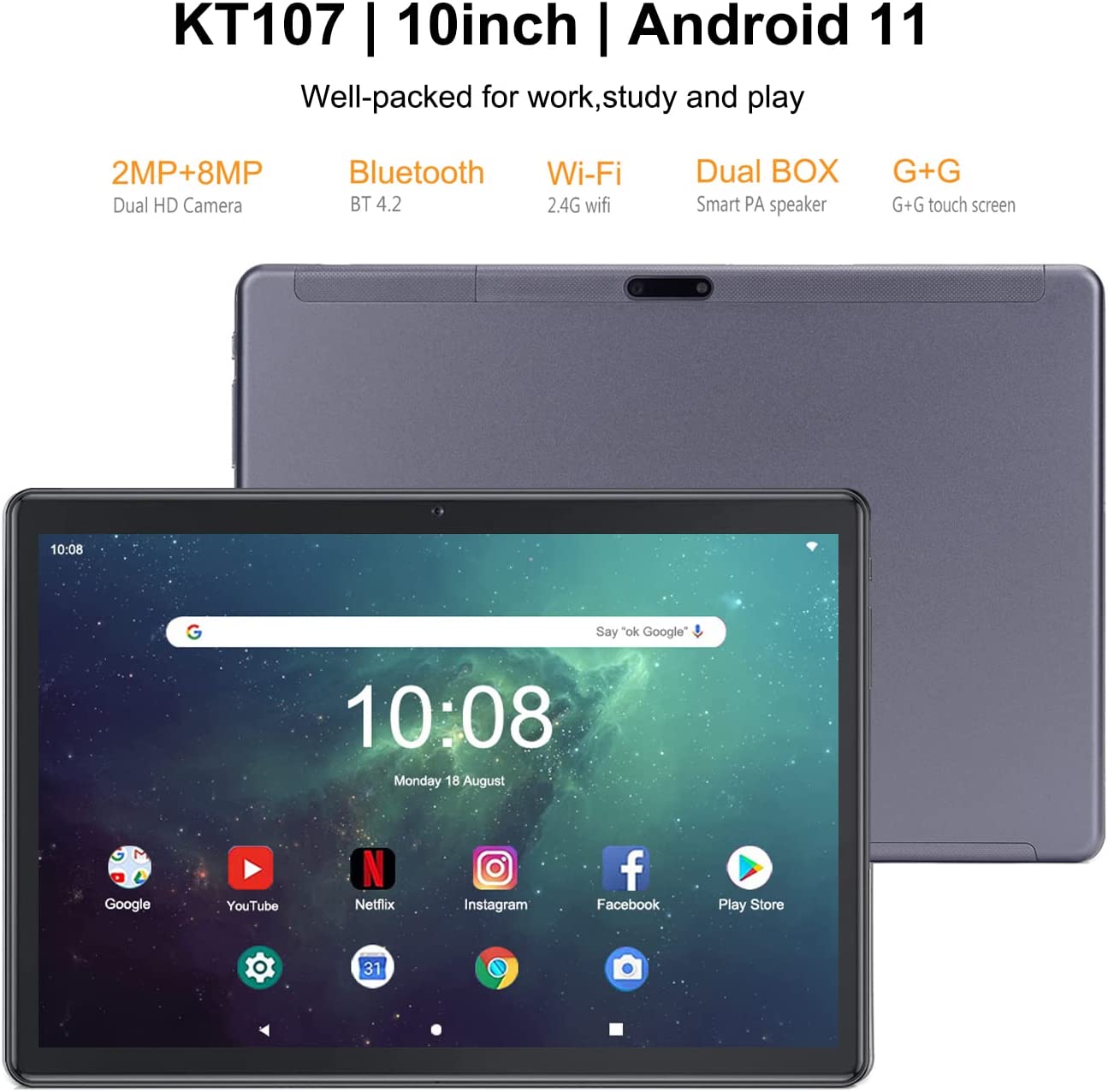- KT107 features a 3GB RAM and a 64-bit Octa-core processor, offering the smooth performance of playing videos, surfing the Internet, running light games, etc. Android 11 Pie enhances performance and reduces ads, giving you a more customized experience.