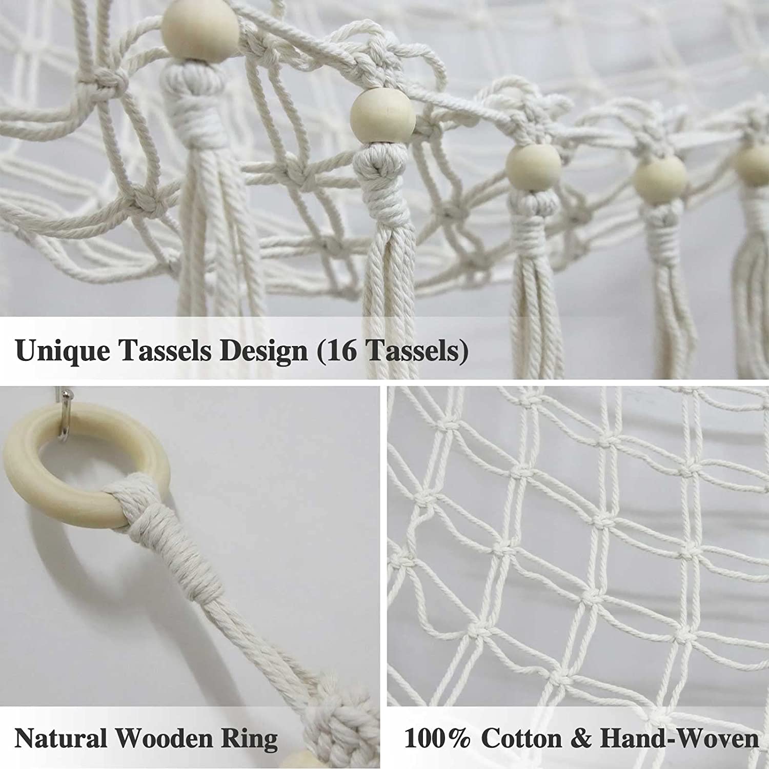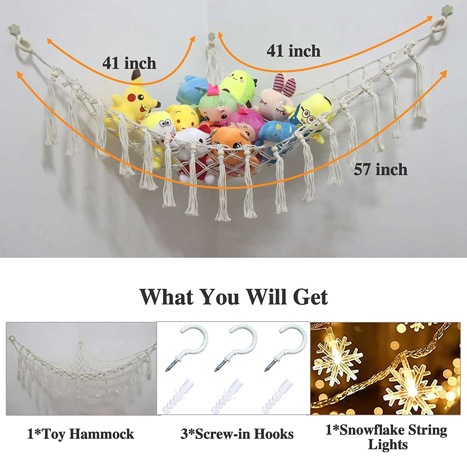 • 【Bohemian Style】Romantic bohemian style, handmade lace rope, decorated with 16 tassels, and snowflake LED light. The toy net hammock for stuffed animals is not just an organizer, it's the perfect decoration.
