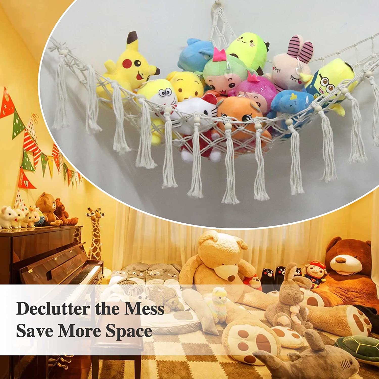 • 【Larger size, More storage】The size of the large stuffed animals hammock is 57*41*41 inches, Take advantage of the triangular corners on the wall to accommodate a large number of kid's stuffed animals without taking up extra floor space.