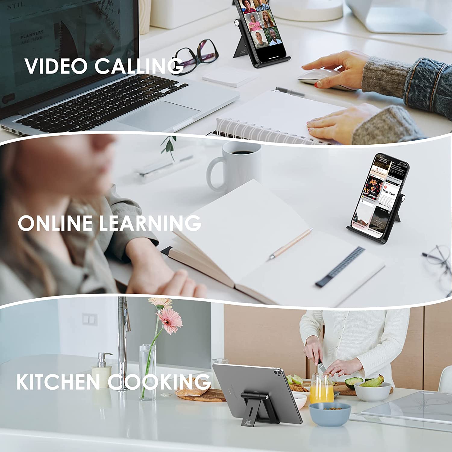 • Portable and Lightweight: Foldable size of 3.78*3.15*0.67 in(L*W*T) and weights only 0.09lbs(40g), compact and portable. The phone holder stand is fully collapsible, it can be easily adjusted to ideal position, free your hands, which is a good desk accessories while watching video, playing games, making phone call, viewing recipes or using Facetime.