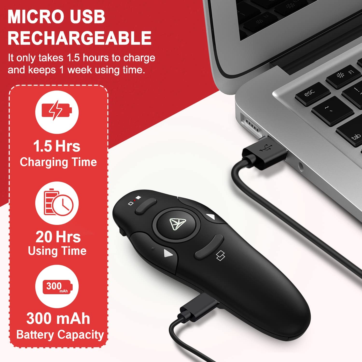 【RECHARGEABLE WIRELESS PRESENTER CONTROL】The slide clicker built-in 300mah battery, 1.5 hours of charging can be used for several weeks, there is a smart sleep mode, sliding the clicker will enter the sleep mode, not in use automatically shut down to save power. Essential presentation tools for the classroom or office.