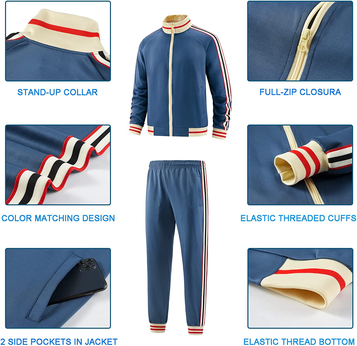 Tracksuit men has a relaxed fit preventing any bunching or tightness; full-zip front offers easy on-and-off, pockets on both track jackets and pants, convenient for you to bring small things with you, like keys, phone