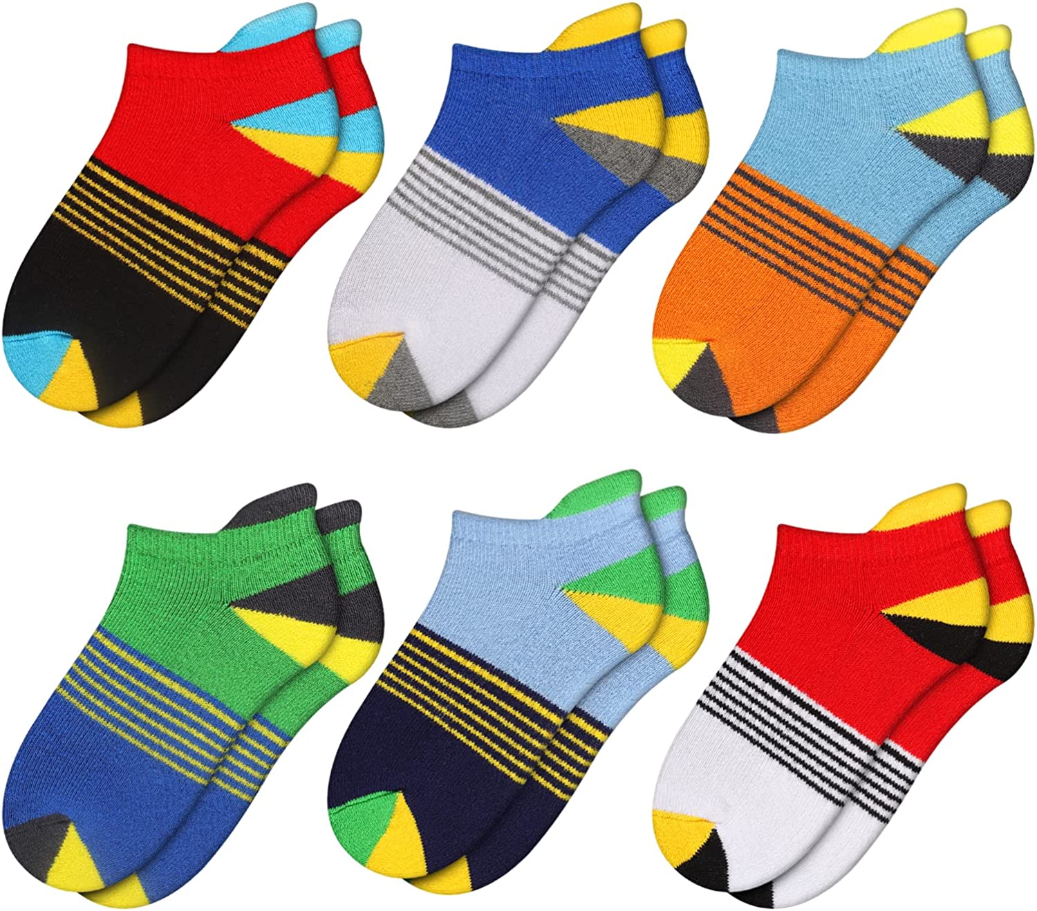 COLORFUL DESIGN: Bright colors to choose from, 6 pairs to get kids through the weekdays. And the darker colored athletic socks are nice for hiding stains from playing outside.