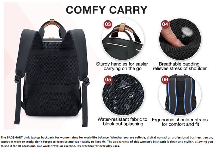 Long-lasting Durability: BAGSMART laptop backpack for women is well made of water-resistant polyester. Metal double-way zippers make opening/closing simple and fast